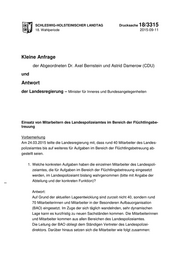 SCHLESWIG-HOLSTEINISCHER LANDTAG Drucksache 18/3315 18. Wahlperiode 2015-09-11 Kleine Anfrage der Abgeordneten Dr. Axel Bernstein und Astrid Damerow (CDU) und Antwort der Landesregierung – Minister für Inneres und Bundesangelegenheiten Einsatz von Mitarbeitern des Landespolizeiamtes im Bereich der Flüchtlingsbe- treuung Vorbemerkung Am 24.03.2015 teilte die Landesregierung mit, dass rund 40 Mitarbeiter des Landes- polizeiamtes bis auf weiteres für Aufgaben im Bereich der Flüchtlingsbetreuung ab- gestellt seien. 1. Welche konkreten Aufgaben haben die einzelnen Mitarbeiter des Landespoli- zeiamtes, die für Aufgaben im Bereich der Flüchtlingsbetreuung eingesetzt werden, im Landespolizeiamt bislang wahrgenommen (bitte mit Angabe der Abteilung und der konkreten Funktion)? Antwort: Auf Grund der aktuellen Lageentwicklung sind zurzeit nicht 40, sondern rund 70 Mitarbeiterinnen und Mitarbeiter in der Besonderen Aufbauorganisation (BAO) eingesetzt. Im Zuge der sich täglich wandelnden, sehr dynamischen Lage kann es kurzfristig zu neuen Sachständen kommen. Die Mitarbeiterinnen und Mitarbeiter kommen aus allen Bereichen des Landespolizeiamtes. Die Leitung der BAO obliegt dem Ständigen Vertreter des Landespolizei- direktors. Darüber hinaus setzen sich die Mitarbeiter wie folgt zusammen: