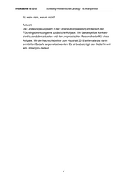 Drucksache 18/3315 Schleswig-Holsteinischer Landtag - 18. Wahlperiode b) wenn nein, warum nicht? Antwort: Die Landesregierung sieht in der Unterstützungsleistung im Bereich der Flüchtlingsbetreuung eine zusätzliche Aufgabe. Die Landespolizei konkreti- siert laufend den aktuellen und den prognostischen Personalbedarf für diese Aufgabe. Mit der Nachschiebeliste zum Haushalt 2016 sollen alle bis dahin ermittelten Bedarfe angemeldet werden. Es ist beabsichtigt, den Bedarf in vol- lem Umfang zu decken. 4