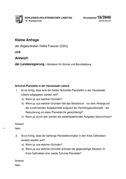 SCHLESWIG-HOLSTEINISCHER LANDTAG Drucksache 18/3946 18. Wahlperiode 2016-03-07 Kleine Anfrage der Abgeordneten Heike Franzen (CDU) und Antwort der Landesregierung - Ministerin für Schule und Berufsbildung Schulrat-Planstelle in der Hansestadt Lübeck 1. Ist es richtig, dass eine der beiden Schulräte-Planstellen in der Hansestadt Lübeck aufgegeben werden soll? a) Wenn ja, aus welchen Gründen? b) Wenn ja, aus welchen Gründen hält das Ministerium - vor dem Hintergrund der zunehmenden Aufgabenfülle aufgrund der Flüchtlingsproblematik - die Reduzierung um diese Planstelle für gerechtfertigt? c) Wenn ja, durch wen werden die weiterbestehenden Aufgaben übernommen? Antwort: Nein. 2. Ist es richtig, dass der bisherige Planstelleninhaber in den Kreis Ostholstein versetzt werden soll? a) Wenn ja, aus welchen Gründen? b) Wenn ja, aus welchen Gründen erfordert die gegenwärtige Situation im Kreis Ostholstein eine zweite Schulrat-Planstelle? Antwort: Nein.
