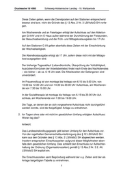 Drucksache 18/ 4995 Schleswig-Holsteinischer Landtag - 18. Wahlperiode Diese Zeiten gelten, wenn die Dienstposten auf den Stationen entsprechend besetzt sind bzw. nicht die Gründe des § 13 Abs. 2 Nr. 3 LStVollzG SH vorlie- gen. Am Wochenende und an Feiertagen erfolgt der Aufschluss auf den Abteilun- gen G III/IV und im E-Haus außer während der Durchführung der Freistunden, der Besuchsabwicklung und der Früh- und Mittagskostausgaben bis 17 Uhr. Auf den Stationen G I/II gelten ebenfalls diese Zeiten mit der Einschränkung der Wechselseitigkeit. Die Abendkostausgabe erfolgt ab 17 Uhr, sofern diese nicht mit der Mittags- kost ausgegeben wird. Der bisherige Tagesablauf (Lebendkontrolle, Überprüfung der Vollzähligkeit, Ausrücken/Einrücken der Arbeitsbetriebe) findet nach Ende des Nachtdienstes – wie bisher – ab ca. 6.15 Uhr statt. Die Arbeitszeiten der Gefangenen sind unverändert. Im Frauenvollzug ist von montags bis freitags von 6.15 bis 8.00 Uhr, von 10.00 bis 12.30 Uhr und von 14.30 bis 20.00 Uhr Aufschluss, am Wochenen- de von 7.30 bis 19.00 Uhr. In der Sozialtherapie ist montags bis freitags von 6.15 bis 20.00 Uhr Auf- schluss, am Wochenende von 7.00 bis 19.00 Uhr. Die Tage, an denen der an sich vorgesehene Aufschluss nicht durchgeführt werden konnte, sind der beigefügten Anlage zu entnehmen. 2. An Tagen ohne oder mit nicht im gesetzlichen Umfang erfolgten Aufschluss: Woran lag das? Antwort: Das Landesstrafvollzugsgesetz gibt keinen Umfang für den Aufschluss vor. Von der regelhaften Gemeinschaftsunterbringung des § 12 LStVollzG SH kann aus den Gründen des § 13 Abs. 2 LStVollzG SH abgewichen werden. Insofern entsprechen Einschlusszeiten aufgrund dieser Möglichkeiten eben- falls dem gesetzlichen Umfang. Dies schließt den Einschluss zur Aufrechter- haltung der Ordnung (Organisationszeiten) gemäß § 13 Abs.2 Nr. 3 2. Alt. LStVollzG SH explizit ein. Die Einschlusszeiten samt Begründung während der o.g. Zeiten sind der als Anlage beigefügten Tabelle zu entnehmen. 2