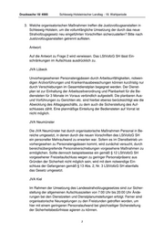Drucksache 18/ 4995 Schleswig-Holsteinischer Landtag - 18. Wahlperiode 3. Welche organisatorischen Maßnahmen treffen die Justizvollzugsanstalten in Schleswig-Holstein, um die vollumfängliche Umsetzung der durch das neue Strafvollzugsgesetz neu eingeführten Vorschriften sicherzustellen? Bitte nach Justizvollzugsanstalten getrennt auflisten. Antwort: Auf die Antwort zu Frage 2 wird verwiesen. Das LStVollzG SH lässt Ein- schränkungen im Aufschluss ausdrücklich zu. JVA Lübeck Unvorhergesehenen Personalengpässen durch Arbeitsunfähigkeiten, notwen- digen Arztvorführungen und Krankenhausbewachungen können kurzfristig nur durch Verschiebungen im Gesamtdienstplan begegnet werden. Der Dienst- plan ist zur Einhaltung der Arbeitszeitverordnung und Planbarkeit für die Be- diensteten für 3 Monate im Voraus verbindlich aufgestellt. Die planbaren Aus- und Vorführungen zu Gerichten etc. sind hierbei ebenso berücksichtigt wie die Abwicklung des Alltagsgeschäfts, zu dem auch die Sicherstellung des Auf- schlusses zählt. Eine planmäßige Einteilung der Bediensteten auf Vorrat ist nicht möglich. JVA Neumünster Die JVA Neumünster hat durch organisatorische Maßnahmen Personal in Be- reiche umgesetzt, in denen durch die neuen Vorschriften des LStVollzG SH ein personeller Mehraufwand zu erwarten war. Sofern es im Dienstbetrieb un- vorhergesehen zu Personalengpässen kommt, wird zunächst versucht, durch bereichsübergreifende Personalverschiebungen vorgesehene Maßnahmen zu ermöglichen. Sollte dennoch beispielsweise ein gemäß § 12 LStVollzG SH vorgesehener Freizeitaufschluss wegen zu geringer Personalpräsenz aus Gründen der Sicherheit nicht möglich sein, wird mit dem notwendige Ein- schluss der Gefangenen gemäß § 13 Abs. 2, Nr. 3 LStVollzG SH ebenfalls das Gesetz umgesetzt. JVA Kiel Im Rahmen der Umsetzung des Landesstrafvollzugsgesetzes sind zur Sicher- stellung der allgemeinen Aufschlusszeiten von 7:00 Uhr bis 20:00 Uhr Ände- rungen bei den Dienstzeiten und Dienstplanumstellungen erfolgt. Ferner sind organisatorische Neuregelungen zu den Freistunden getroffen worden, um hier mit einem geringeren Personalaufwand bei gleichzeitiger Sicherstellung der Sicherheitsbedürfnisse agieren zu können. 3