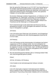 Drucksache 18/ 4995 Schleswig-Holsteinischer Landtag - 18. Wahlperiode Nach den gemachten Erfahrungen ist zum 01.01.2017 eine Hausverfügung zu 30 minütigen Organisationseinschlusszeiten in Kraft gesetzt worden, um ei- nerseits eine ordnungsgemäße Reinigung der Abteilungen sicherzustellen und andererseits Gefahrenmomente (Rutschgefahr feuchter, frisch gewischter Fußböden z.B. bei Alarmfällen) auszuschließen. Die einzelnen Abteilungen erarbeiten Tagesstrukturen, um Kollisionen von Ab- teilungsabläufen( z.B. Telefonzeiten, Duschzeiten) mit Freizeitangeboten zu verhindern und für Vertretungsfälle erkennbare Regelungen vorzuhalten. Soweit die Belegungssituation es zulässt, werden unbelegte Hafträume als Freizeiträume auf den Abteilungen zur Verfügung gestellt. Durch Umstrukturierungen wurde insbesondere das Personal auf der Zu- gangsabteilung verstärkt, um den Zeitvorgaben des Gesetzes für die Erstel- lung von Vollzugsplänen zu genügen. JVA Itzehoe In der JVA Itzehoe waren Änderungen nicht erforderlich, da die Strafgefange- nen schon vor Inkrafttreten des neuen Strafvollzugsgesetzes Aufschluss bis 21.00 Uhr hatten. JVA Flensburg In der JVA Flensburg sind die Aufschlusszeiten mit Inkrafttreten des Strafvoll- zugsgesetzes auf 20 Uhr verlängert worden. Durch die verlängerten Auf- schlusszeiten wurden die Schichtdienstzeiten des Allgemeinen Vollzugsdiens- tes angepasst. Es werden vermehrt Freizeit-, Sport- und Bildungsmaßnahmen angeboten, die zum einen vom Allgemeinen Vollzugsdienst und zum anderen durch externe Kräfte angeboten werden. 4. Wie viele behindertengerechte Haftzellen gibt es in Schleswig-Holstein? Bitte nach Justizvollzugsanstalt getrennt auflisten. Antwort: JVA Kiel, JVA Itzehoe, JVA Flensburg In den Anstalten ist kein behindertengerechter Haftraum vorhanden. JVA Lübeck In der JVA Lübeck gibt es insgesamt 4 behindertengerechte Haftplätze. Davon ist jeweils ein Platz im geschlossenen Männervollzug sowie einer im geschlossenen Frauenvollzug. Diese beiden Haftplätze sind nur für behinderte 4