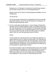 Drucksache 18/ 4995 Schleswig-Holsteinischer Landtag - 18. Wahlperiode Gefangene bzw. für Gefangene mit körperlichen Einschränkungen geeignet, die sich selbst versorgen können und nicht pflegebedürftig sind. Weiterhin besitzt die JVA Lübeck 2 behindertengerechte Haftplätze in der Sa- nitätsabteilung. JVA Neumünster Die JVA Neumünster verfügt derzeit im Strafhaftbereich über einen behinder- tengerechten Haftraum, der sich für die Unterbringung von Gefangenen mit körperlichen Beeinträchtigungen eignet. 5. Sind der Landesregierung Fälle bekannt, in denen Anträge auf Reststrafent- lassungen nach § 57 StVollzG abgelehnt wurden mit der Begründung, dass in der Justizvollzugsanstalt die hierfür erforderlichen Vorbereitungen (Vollzugslo- ckerungen, Ausführungen, etc.) nicht geleistet werden konnten? Falls ja: Wie viele und aus welchen Gründen konnten die Vorbereitungen nicht geleistet werden? Bitte nach Justizvollzugsanstalten getrennt auflisten. Antwort: Für alle Anstalten gilt, dass die Gründe für eine erfolgte oder abgelehnte vor- zeitige Entlassung nach § 57 StGB nicht erfasst werden. Die Frage lässt sich daher in der zur Verfügung stehenden Zeit nicht beantworten, da dazu sämtli- che Gefangenenpersonalakten der zurzeit in Haft befindlichen sowie der ehe- maligen Gefangenen durchgesehen und die Beschlüsse auf die Begründung der Entscheidung hin geprüft werden müssten. Es ist darauf hinzuweisen, dass eine Strafrestaussetzung auch ohne vorherige Lockerungsentscheidung möglich ist, da die Voraussetzungen für eine Locke- rung (vgl. § 55 Abs. 2 LStVollzG SH) und eine Strafrestaussetzung (§ 57 StGB) unterschiedlich sind. Es ist also möglich, dass ein Gefangener nicht lo- ckerungsgeeignet ist, dennoch aber eine Strafrestaussetzung erhält. 5