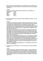 7. Welche Kosten sind der öffentlichen Hand (Körperschaften und Anstalten des öffentlichen Rechts sowie öffentlichen Unternehmen) durch die Reise insgesamt entstanden? Antwort: Es sind ca. 31.364 € an Gesamtkosten entstanden. Davon entfallen auf: Staatskanzlei 11.500 € MWAVT 9.512 € MSB 3.659 € MELUR 1.952 € WTSH 4.741 € 8. Welche Gastgeschenke wurden gemacht oder entgegen genommen und in wel- chem Wert? Antwort: Im Rahmen eines offiziellen Geschenkeaustausches aus Anlass der 9. gemein- samen Sitzung der Schleswig-Holstein – Zhejiang Förderkommission wurde der Vorsitzenden der Förderkommission auf chinesischer Seite eine Original- Lithographie von Armin Mueller Stahl (gerahmt) überreicht (Wert 195,- €). Im Ge- genzug erhielten der Wirtschaftsminister und der Chef der Staatskanzlei jeweils eine jadegrüne Vase aus Steingut in einem repräsentativen Holzkasten, deren Wert hier nicht bekannt ist. Beim Besuch des Chinesisch-Deutschen Instituts für angewandte Ingenieurwis- senschaften der Zhejiang University of Science and Technologie ist dem Chef der Staatskanzlei ein Holzschnittbild überreicht worden, dessen Wert ebenfalls nicht bekannt ist. Anlässlich des außerplanmäßigen Besuchs des Industriegebie- tes der Stadt Jiaxing wurde Minister Meyer eine Seidenwandrolle überreicht, dessen Wert nicht bekannt ist. Bei den weiteren überreichten Gastgeschenken an die chinesischen Gesprächs- partner oder an die Repräsentanten der deutschen Firmenniederlassungen han- delt es sich um kleine Aufmerksamkeiten (Manschettenknöpfe, Flaschenver- schluss, Marzipan, Kugelschreiber, etc.) aus dem Bestand des Protokolls. Erhal- tene Gastgeschenke werden nach Abschluss der Reise katalogisiert und archi- viert. Alle Reiseteilnehmenden haben kleine Aufmerksamkeiten an einigen Pro- grammstationen erhalten. Die WTSH hat geringwertige Gastgeschenke (z. B. Kofferbänder) verteilt und er- halten (z. B. Teebecher). 9. Ist die Internet- und Pressezensur in China von Seiten des Landes thematisiert worden? Antwort: In der 9. gemeinsamen Sitzung der Schleswig-Holstein – Zhejiang Förderkom- mission wurden ausschließlich die Themen Umsetzung des Memorandums der 8. Sitzung der Förderkommission sowie die Maßnahmen und Kooperationspro- jekte für die kommenden Jahre (Zusammenarbeit in den Bereichen Wirtschaft und Weiterbildung, Umwelt- und Energie, Hochschulen, Bildung und Schule) an- gesprochen. 3