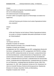 Drucksache 18/165 Schleswig-Holsteinischer Landtag - 18. Wahlperiode Antwort: Diese Kosten werden aus folgenden Haushaltstiteln gedeckt: 0701-531 02 (Öffentlichkeitsarbeit), 0701-546 99 (Vermischte Verwaltungsaufgaben), 0710-533 13 (MG 13) (Ausgaben aufgrund von Werkverträgen und anderen Auf- tragsformen). c) Wird die Finanzierung der Konferenz durch andere Organisationen/Instituti- onen unterstützt? Antwort: Nein. d) Wie viele Teilnehmer hat die Konferenz? Welche Organisationen/Institutio- nen wurden zur Konferenz eingeladen (bitte jeweils aufschlüsseln mit Anzahl der Teilnehmerplätze)? Antwort: 122 Personen nahmen teil. Eingeladen mit jeweils vier Vertretern: Christian-Albrechts-Universität zu Kiel, Universität Flensburg Eingeladen mit jeweils zwei Vertretern: Landtagsfraktion der CDU, Landtagsfraktion der SPD, Landtagsfraktion Bündnis 90/ Die Grünen, Landtagsfraktion der FDP, Landtagsfraktion DIE PIRATEN, Landtags- fraktion des SSW, Landesschülervertreter der Gymnasien, Landesschülervertreter der Gemeinschaftsschulen, Landesschülervertreter der Regionalschulen, Landes- schülervertreter der Förderzentren, Landesschülervertreter der berufsbildenden Schulen, Landeselternbeirat der Gymnasien, Landeselternbeirat der Gemeinschafts- schulen, Landeselternbeirat der Regionalschulen, Landeselternbeirat der Grundschu- len und Förderzentren, Landeselternbeirat der Beruflichen Schulen, GEW, Philo- logenverband, IVL, VBE, VLBS, Studentische Vertreter der CAU, Studentische Ver- treter der Universität Flensburg, Direktorenverbindungsausschuss, Staatskanzlei, Ministerium für Soziales, Gesundheit, Familie und Gleichstellung. Eingeladen mit jeweils einem Vertreter: 2