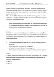 Drucksache 18/165 Schleswig-Holsteinischer Landtag - 18. Wahlperiode Lübeck, Muthesius Kunsthochschule, Behörde für Schule und Berufsbildung der Hansestadt Hamburg, Konferenz der Schulaufsicht in Schleswig Holstein, Hauptper- sonalrat der Lehrkräfte, Hauptvertrauensperson der schwerbehinderten Lehrkräfte. Zudem nahmen teil: Mitarbeiter des MBW und des Instituts für Qualitätsentwicklung an Schulen Schles- wig-Holstein, Lehrkräfte und Schüler der Toni-Jensen-Gemeinschaftsschule (Veran- staltungsort), Verbindungslehrkräfte. e) Wie viele Mitarbeiterinnen und Mitarbeiter des Bildungsministeriums wurden zur Vorbereitung der Konferenz eingesetzt? Was wurde inhaltlich durch das Bil- dungsministerium für die Konferenz vorbereitet? Antwort: Die Konferenz wurde von vier Mitarbeiterinnen und Mitarbeitern vorbereitet. Zur in- haltlichen Vorbereitung gehörten Vorgespräche mit den Moderatoren, die Benennung von Workshop-Themen in der Einladung und die Erstellung von Fakten-Plakaten für die Workshop-Räume. 2. Die Bildungskonferenz am 8. September 2012 wird als Auftaktveranstaltung bezeichnet. a) Welche weiteren Veranstaltungen sind geplant? b) Welche Kosten fallen für diese Veranstaltungen an? c) Aus welchem Haushaltstitel werden gegebenenfalls diese Kosten gedeckt? Antwort: a) Welche weiteren Veranstaltungen es geben wird, richtet sich nach der Auswertung der Ergebnisse der Bildungskonferenz und des begleitenden Internetforums, die noch nicht abgeschlossen ist. b) siehe a) c) siehe a) 4