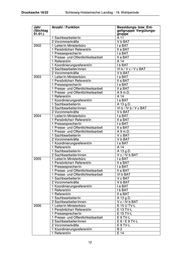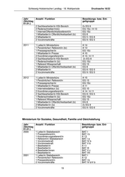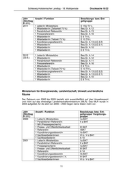 Schleswig-Holsteinischer Landtag - 18. Wahlperiode Drucksache 18/22 Jahr Anzahl / Funktion Besoldungs- bzw. Ent- (Stichtag geltgruppe 01.01.) 2011 1 Leiter/in Ministerbüro E 15Ü TV-L 1 Mitarbeiter/in (Zeitanteil 75 %) Bes.Gr. A 12 1 Persönliche/r Referent/in Bes.Gr. A 13 1 Pressereferent/in Bes.Gr. A 16 1 Mitarbeiter/in E 6 TV-L 1 Mitarbeiter/in (Teilzeit 75 %) E 10 TV-L 1 Koordinierungsreferent/in Bes.Gr. A 13 (LG 2.2) 1 Mitarbeiter/in Bes.Gr. A 13 (LG 2.1) 1 Mitarbeiter/in Bes.Gr. A 10 1 Mitarbeiter/in E 8 TV-L 2012 1 Leiter/in Ministerbüro Bes.Gr. A 14 (22.6.) 1 Mitarbeiter/in Bes.Gr. A 12 1 Persönliche/r Referent/in Bes.Gr. A 11 1 Pressereferent/in Bes.Gr. A 16 1 Mitarbeiter/in E 6 TV-L 1 Mitarbeiter/in (Teilzeit 75 %) E 10 TV-L 1 Koordinierungsreferent/in Bes.Gr. A 13 (LG 2.2) 1 Mitarbeiter/in Bes.Gr. A 13 (LG 2.1) 1 Mitarbeiter/in Bes.Gr. A 10 1 Mitarbeiter/in E 8 TV-L Ministerium für Energiewende, Landwirtschaft, Umwelt und ländliche Räume Der Zeitraum von 2000 bis 2003 bezieht sich ausschließlich auf das Umweltressort und nicht auf das ehemalige Landwirtschaftsministerium (MLR). Das MLR wurde in 2003 aufgelöst, für die Zeit von 2000 – 2003 liegen keine Daten mehr vor. Jahr Anzahl / Funktion Besoldungs- bzw. Ent- (Stichtag geltgruppe/ Vergütungs- 01.01.) gruppe 2000 1 Leiter/in Ministerbüro I a BAT 1 Persönliche/r Referent/in II a BAT 1 NN (Pressesprecher/in) 1 Presse- und Öffentlichkeitsarbeit III BAT 1 Referent/in I BAT 1 Koordinierungsreferent/in I b BAT 2 Sachbearbeiter/innen VI b / V c BAT 1 Sachbearbeiter/in A 10 2001 1 Leiter/in Ministerbüro I a BAT 1 Persönliche/r Referent/in II a BAT 1 Pressesprecher/in I a BAT 1 Presse- und Öffentlichkeitsarbeit III BAT 1 Referent/in A 14 1 Koordinierungsreferent/in I b BAT 1 Koordinierungsreferent/in i.V. III BAT 2 Sachbearbeiter/innen VI b / V c BAT 11