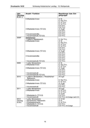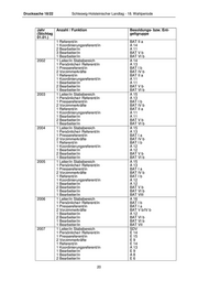 Drucksache 18/22 Schleswig-Holsteinischer Landtag - 18. Wahlperiode Jahr Anzahl / Funktion Besoldungs- bzw. Ent- (Stichtag geltgruppe 01.01.) 1 Referent/in BAT II a 1 Koordinierungsreferent/in A 14 2 Bearbeiter/in A 11 3 Bearbeiter/in BAT V b 1 Bearbeiter/in BAT VI b 2002 1 Leiter/in Stabsbereich A 14 1 Persönliche/r Referent/in A 13 1 Pressereferent/in BAT I b 2 Vorzimmerkräfte BAT IV b 1 Referent/in BAT II a 1 Koordinierungsreferent/in A 11 1 Bearbeiter/in A 11 2 Bearbeiter/in BAT V b 1 Bearbeiter/in BAT VI b 2003 1 Leiter/in Stabsbereich A 15 1 Persönliche/r Referent/in A 13 1 Pressereferent/in BAT I b 2 Vorzimmerkräfte BAT IV b 1 Referent/in BAT II a 1 Koordinierungsreferent/in A 11 1 Bearbeiter/in A 11 2 Bearbeiter/in BAT V b 1 Bearbeiter/in BAT VI b 2004 1 Leiter/in Stabsbereich A 15 1 Persönliche/r Referent/in A 13 1 Pressereferent/in BAT I a 2 Vorzimmerkräfte BAT IV b 1 Referent/in BAT I b 1 Koordinierungsreferent/in A 12 1 Bearbeiter/in A 12 2 Bearbeiter/in BAT V b 1 Bearbeiter/in BAT VI b 2005 1 Leiter/in Stabsbereich A 15 1 Persönliche/r Referent/in A 13 1 Pressereferent/in BAT I a 2 Vorzimmerkräfte BAT IV b 1 Referent/in BAT I b 1 Koordinierungsreferent/in A 12 1 Bearbeiter/in A 12 2 Bearbeiter/in BAT V b 1 Bearbeiter/in BAT VI b 1 Bearbeiter/in BAT VIII 2006 1 Leiter/in Stabsbereich A 16 1 Persönliche/r Referent/in BAT I b 1 Pressereferent/in BAT I a 2 Vorzimmerkräfte BAT V b/IV b 1 Bearbeiter/in A 12 2 Bearbeiter/in BAT VI b 1 Bearbeiter/in BAT VI b 1 Bearbeiter/in BAT VII 2007 1 Leiter/in Stabsbereich SDV 1 Persönliche/r Referent/in E 14 1 Pressereferent/in E 15 2 Vorzimmerkräfte E9 1 Referent/in E 14 1 Koordinierungsreferent/in A 13 1 Bearbeiter/in E9 1 Bearbeiter/in A8 2 Bearbeiter/in E6 20