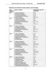 Schleswig-Holsteinischer Landtag - 18. Wahlperiode Drucksache 18/22 Ministerium für Wirtschaft, Arbeit, Verkehr und Technologie Jahr Anzahl / Funktion Besoldungs- bzw. Ent- (Stichtag geltgruppe 01.01.) 2000 1 Leiter/in Ministerbüro A 14 1 Persönliche/r Referent A 13 1 Koordinierungsreferent/in A 12 1 Sachbearbeiter/in KSt-Bereich A 10 2 Vorzimmerkräfte V b + VI b 2001 1 Leiter/in Ministerbüro A 14 1 Persönliche/r Referent II a 1 Koordinierungsreferent/in A 12 2 Sachbearbeiter/in KSt-Bereich A 11 / V b 1 Mitarbeiter/in Vc 2 Vorzimmerkräfte Vb+Vc 2002 1 Leiter/in Ministerbüro A 14 1 Persönliche/r Referent II a 1 Koordinierungsreferent/in A 12 2 Sachbearbeiter/in KSt-Bereich A 11 / V b 1 Mitarbeiter/in Vc 2 Vorzimmerkräfte Vb+Vc 2003 1 Leiter/in Ministerbüro A 15 1 Persönliche/r Referent II a 1 Koordinierungsreferent/in A 12 2 Sachbearbeiter/in KSt-Bereich A 12 / V b 1 Mitarbeiter/in Vc 2 Vorzimmerkräfte Vb+Vc 2004 1 Leiter/in Ministerbüro A 15 1 Persönliche/r Referent II a 2 Koordinierungsreferent/in A 12 / A 14 2 Sachbearbeiter/in KSt-Bereich A 12 / V b 1 Mitarbeiter/in Vc 2 Vorzimmerkräfte Vb+Vc 2005 1 Leiter/in Ministerbüro A 15 1 Persönliche/r Referent II a 2 Koordinierungsreferent/in A 12 / A 15 2 Sachbearbeiter/in KSt-Bereich A 12 / V b 1 Mitarbeiter/in Vc 2 Vorzimmerkräfte 2x V b 2006 1 Leiter/in Ministerbüro A 16 1 Persönliche/r Referent II a 1 Pressesprecher/in Ia 1 Mitarbeiter/in Presse A 12 1 Redenschreiber/in A 13 2 Koordinierungsreferent/in 2x A 13 1 Referent/in Wissenschaft Ia 2 Sachbearbeiter/in KSt-Bereich VII / IV b 1 Internet/Öffentlichkeitsreferent/in Ia 17