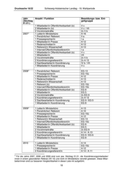 Schleswig-Holsteinischer Landtag - 18. Wahlperiode Drucksache 18/22 Jahr Anzahl / Funktion Besoldungs- bzw. Ent- (Stichtag geltgruppe 01.01.) 2 Sachbearbeiter/in KSt-Bereich 2x EG 6 2 Redenschreiber/in(tz) EG 15ü / A 13 1 Internet/Öffentlichkeitsreferent/in EG 15ü 1 Mitarbeiter/in Öffentlichkeitsarbeit (tz) EG 8 2 Mitarbeiter/in EG 5 / EG 8 2 Vorzimmerkräfte EG 9 / EG 5 2011 1 Leiter/in Ministerbüro A 14 1 Persönliche/r Referent/in (tz) A 13 1 Pressesprecher/in EG 15ü 1 Mitarbeiter/in Presse A 10 2 Koordinierungsreferent/in A 14 / A 11 2 Sachbearbeiter/in KSt-Bereich 2x EG 8 1 Redenschreiber/in (tz) EG 15ü 1 Referent Wissenschaft EG 13 1 Mitarbeiter/in Öffentlichkeitsarbeit (tz) EG 8 2 Mitarbeiter/in EG 8 / EG 5 2 Vorzimmerkräfte EG 9 / EG 5 2012 1 Leiter/in Ministerbüro A 15 1 Persönliche/r Referent/in EG 13 1 Pressesprecher/in EG 15ü 1 Mitarbeiter/in Presse A 11 1 Internetredakteur (tz) EG 10 2 Koordinierungsreferent/in A 14 / A 11 2 Sachbearbeiter/in KSt-Bereich EG 8 / EG 5 1 Redenschreiber/in (tz) EG 15ü 1 Referent Wissenschaft EG 13 1 Mitarbeiter/in Öffentlichkeitsarbeit (tz) EG 8 2 Mitarbeiter/in (tz) 2x EG 8 2 Vorzimmerkräfte EG 9 / EG 6 Ministerium für Soziales, Gesundheit, Familie und Gleichstellung Jahr Anzahl / Funktion Besoldungs- bzw. Ent- (Stichtag geltgruppe 01.01.) 2000 1 Leiter/in Stabsbereich BAT I 1 Pressereferent/in BAT I b 1 Koordinierungsreferent/in A 13 1 Referent/in Stabsbereich BAT I a 1 Vorzimmerkraft BAT IV b 1 Vorzimmerkraft BAT V b 1 Bearbeiter/in A 11 1 Bearbeiter/in BAT III 4 Bearbeiter/innen BAT V c 1 Bearbeiter/in BAT VII 2001 1 Leiter/in Stabsbereich BAT I 1 Persönliche/r Referent/in A 12 1 Pressereferent/in BAT I b 2 Vorzimmerkräfte BAT IV b/V b 19