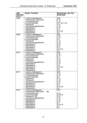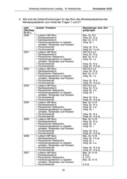 Schleswig-Holsteinischer Landtag - 18. Wahlperiode Drucksache 18/22 Jahr Anzahl / Funktion Besoldungs- bzw. Ent- (Stichtag geltgruppe 01.01.) 2008 1 Leiter/in Stabsbereich SDV 1 Persönliche/r Referent/in E 14 1 Pressereferent/in E 15 3 Vorzimmerkräfte E6/E9/E9 1 Referent/in E 14 1 Koordinierungsreferent/in A 13 1 Bearbeiter/in E 13 1 Bearbeiter/in E9 1 Bearbeiter/in A 9 m.D. 2 Bearbeiter/in E6 2009 1 Leiter/in Stabsbereich SDV 1 Persönliche/r Referent/in E 14 1 Pressereferent/in E 15 2 Vorzimmerkräfte E9 1 Referent/in E 14 1 Koordinierungsreferent/in A 13 1 Bearbeiter/in E 13 1 Bearbeiter/in E 12 1 Bearbeiter/in E9 1 Bearbeiter/in A 9 m.D. 2 Bearbeiter/in E6 2010 1 Leiter/in Stabsbereich SDV 1 Persönliche/r Referent/in E 14 1 Pressereferent/in E 15 2 Vorzimmerkräfte E9 1 Referent/in E 14 1 Referent/in E 15 1 Koordinierungsreferent/in A 13 1 Bearbeiter/in E 12 1 Bearbeiter/in E9 1 Bearbeiter/in A 9 m.D. 1 Bearbeiter/in E8 1 Bearbeiter/in E6 2011 1 Leiter/in Stabsbereich SDV 1 Persönliche/r Referent/in E 14 1 Pressereferent/in E 15 2 Vorzimmerkräfte E9 1 Referent/in E 14 1 Referent/in E 15 1 Koordinierungsreferent/in E 14 1 Bearbeiter/in E 12 1 Bearbeiter/in E9 1 Bearbeiter/in A 9 m.D. 1 Bearbeiter/in E6 2012 1 Leiter/in Stabsbereich SDV 1 Persönliche/r Referent/in NN 1 Pressereferent/in E 15 2 Vorzimmerkräfte E 9/ E 9 1 Referent/in (GI) E 15 1 Koordinierungsreferent/in A 13 1 Bearbeiter/in E 12 1 Bearbeiter/in A 12 1 Bearbeiter/in E9 1 Bearbeiter/in A 9 m.D. 1 Bearbeiter/in E6 1 Bearbeiter/in E8 21