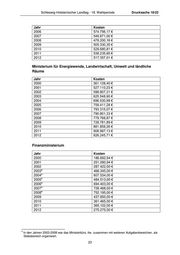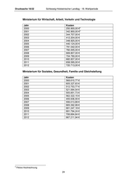 Schleswig-Holsteinischer Landtag - 18. Wahlperiode Drucksache 18/22 Jahr Kosten 2006 574.756,17 € 2007 546.871,00 € 2008 478.200,16 € 2009 505.330,35 € 2010 528.680,81 € 2011 538.235,65 € 2012 517.357,01 € Ministerium für Energiewende, Landwirtschaft, Umwelt und ländliche Räume Jahr Kosten 2000 361.128,40 € 2001 527.110,23 € 2002 598.807,31 € 2003 625.548,90 € 2004 696.530,99 € 2005 759.411,28 € 2006 793.315,07 € 2007 790.801,33 € 2008 779.768,87 € 2009 728.781,89 € 2010 881.858,26 € 2011 908.997,13 € 2012 826.245,71 € Finanzministerium Jahr Kosten 2000 186.692,94 € 2001 251.090,94 € 2002 287.422,00 € 4 2003 466.345,00 € 4 2004 607.534,00 € 4 2005 484.513,00 € 4 2006 694.403,00 € 4 2007 726.468,00 € 4 2008 752.195,00 € 2009 437.650,00 € 2010 361.465,00 € 2011 365.102,00 € 2012 275.275,00 € 4 In den Jahren 2003-2008 war das Ministerbüro, tlw. zusammen mit weiteren Aufgabenbereichen, als Stabsbereich organisiert. 23