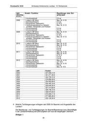 Jahr Besoldung Tarif lineare Steigerung Einmalzahlung Sonstiges lineare Steigerung Einmalzahlung Sonstiges 2009 3,0 % + 40 € Sockel ab EZ von 40 € im 3,0 % + 40 € Sockel EZ von 40 € im 01.03.2009 Februar 2009 ab 01.03.2009 Februar 2009 2010 1,2 % ab 01.03.2010 1,2 % ab 01.03.2010 2011 1,5 % ab 01.04.2011 01.06.2011 360 € 1,5 % ab 01.04.2011 01.06.2011 360 € (Anwärter 120 €) (Azubis 120 €) 2012 1,7 % + 17 € Sockel ab 1,9 % + 17 € Sockel 01.01.2012 (Anwärter 6 € ab 01.01.2012 1 Sockel) (Azubis 6 € Sockel) 1) Ab 01.01.1999 sind jährlich 0,2 % der Besoldungsanpassung einer Versorgungsrücklage zuzuführen; für die Zeit vom 01.01.2003 ist die Regelung für insgesamt 8 Besoldungserhöhungen ausgesetzt; mit der Besoldungserhöhung zum 01.01.2012 Fortsetzung der Zuführung. Anlage 1