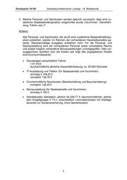 Drucksache 18/105 Schleswig-Holsteinischer Landtag - 18. Wahlperiode 3. Welche Personal- und Sachkosten werden dadurch verursacht, dass eine zu- sätzliche Staatssekretärsposition eingerichtet wurde (Vorzimmer, Dienstfahr- zeug, Fahrer usw.)? Antwort: Alle Personal- und Sachkosten, die durch eine zusätzliche Staatssekretärspo- sition entstehen, werden im Rahmen der vorhandenen Haushaltsansätze ge- deckt; Überplanmäßige Ausgaben entstehen nicht. Für die Personal- und Sachausstattung wird auf vorhandenes Personal sowie vorhandene Räume und soweit möglich vorhandene Büroausstattungen zurückgegriffen. Dies vor- ausgeschickt, beziffern sich die Kosten wie folgt (die angegebenen Kosten sind Durchschnittswerte): Dienstwagen einschließlich Fahrer: 1,91 €/km durchschnittliche jährliche Gesamtfahrleistung: ca. 30.000 Kilometer IT-Ausstattung und Telefon (für Staatssekretär und Vorzimmer): einmalig 2.109,25 € monatlich 136,78 € Durchschnittliche Raumkosten (Bewirtschaftung und Bauunterhaltung): monatlich 128,25 € Büroausstattung (für Staatssekretär und Vorzimmer): einmalig 4.140 € Gehaltskosten Sekretärin: jährlich 54.228,77 € (durchschnittlicher Jahres- wert Entgeltgruppe 9 TV-L einschließlich Lohnnebenkosten mit Arbeitge- beranteil zur Sozialversicherung, ohne Gemeinkosten) 2