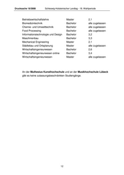 Drucksache 18/3888 Schleswig-Holsteinischer Landtag - 18. Wahlperiode Betriebswirtschaftslehre Master 2,1 Biomedizintechnik Bachelor alle zugelassen Chemie- und Umwelttechnik Bachelor alle zugelassen Food Processing Bachelor alle zugelassen Informationstechnologie und Design Bachelor 3,2 Maschinenbau Bachelor 3,3 Mechanical Engineering Master 2,1 Städtebau und Ortsplanung Master alle zugelassen Wirtschaftsingenieurwesen Bachelor 2,6 Wirtschaftsingenieurwesen online Bachelor 3,4 Wirtschaftsingenieurwesen Master alle zugelassen An der Muthesius Kunsthochschule und an der Musikhochschule Lübeck gibt es keine zulassungsbeschränkten Studiengänge. 12