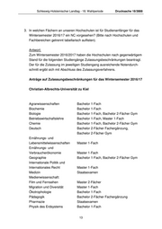 Schleswig-Holsteinischer Landtag - 18. Wahlperiode Drucksache 18/3888 3. In welchen Fächern an unseren Hochschulen ist für Studienanfänger für das Wintersemester 2016/17 ein NC vorgesehen? (Bitte nach Hochschulen und Fachbereichen getrennt tabellarisch auflisten). Antwort: Zum Wintersemester 2016/2017 haben die Hochschulen nach gegenwärtigem Stand für die folgenden Studiengänge Zulassungsbeschränkungen beantragt. Der für die Zulassung im jeweiligen Studiengang ausreichende Notendurch- schnitt ergibt sich mit Abschluss des Zulassungsverfahrens. Anträge auf Zulassungsbeschränkungen für das Wintersemester 2016/17 Christian-Albrechts-Universität zu Kiel Agrarwissenschaften Bachelor 1-Fach Biochemie Bachelor 1-Fach Biologie Bachelor 1-Fach, Bachelor 2-Fächer Gym Betriebswirtschaftslehre Bachelor 1-Fach, Master 1-Fach Chemie Bachelor 1-Fach, Bachelor 2-Fächer Gym Deutsch Bachelor 2-Fächer Fachergänzung, Bachelor 2-Fächer Gym Ernährungs- und Lebensmittelwissenschaften Master 1-Fach Ernährungs- und Verbraucherökonomie Master 1-Fach Geographie Bachelor 1-Fach, Bachelor 2-Fächer Gym Internationale Politik und Internationales Recht Master 1-Fach Medizin Staatsexamen Medienwissenschaft: Film und Fernsehen Master 2-Fächer Migration und Diversität Master 1-Fach Ökotrophologie Bachelor 1-Fach Pädagogik Bachelor 2-Fächer Fachergänzung Pharmazie Staatsexamen Physik des Erdsystems Bachelor 1-Fach 13