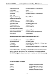 Drucksache 18/3888 Schleswig-Holsteinischer Landtag - 18. Wahlperiode Politikwissenschaft Bachelor 2-Fächer Fachergänzung Psychologie* Diplom Rechtswissenschaft Staatsexamen Soziologie Bachelor 2-Fächer Fachergänzung Stadt- und Regionalentwicklung Master 1-Fach Umweltgeographie und -management Master 1-Fach Volkswirtschaftslehre Bachelor 1-Fach Wirtschaft/Politik Bachelor 2-Fächer Gym Wirtschaftschemie Bachelor 1-Fach Wirtschaftsinformatik Bachelor 1-Fach Wirtschaftsingenieurwesen Elektro- und Informationstechnik Bachelor 1-Fach Wirtschaftswissenschaft Bachelor 2-Fächer Handelslehrer Zahnmedizin Staatsexamen Neu beantragt wurden für das Wintersemester 2016/2017: Europäische Ethnologie Bachelor 2-Fächer Geowissenschaften Bachelor 1-Fach Philosophie Bachelor 2-Fächer, Bachelor 2-Fächer Gym Psychologie* Bachelor 1-Fach Sportwissenschaft Bachelor 2-Fächer, Bachelor 2-Fächer Gym * Der Bachelor 1-Fach Psychologie befindet sich noch im Genehmigungsver- fahren. Sollte dies rechtzeitig für den Studienbeginn zum Wintersemester 2016/2017 erfolgreich abgeschlossen sein, ersetzt er den Diplomstudiengang. Europa-Universität Flensburg Biologie B.A. Bildungswissenschaften Chemie B.A. Bildungswissenschaften Deutsch B.A. Bildungswissenschaften Englisch B.A. Bildungswissenschaften 14
