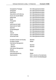 Schleswig-Holsteinischer Landtag - 18. Wahlperiode Drucksache 18/3888 Evangelische Theologie B.A. Bildungswissenschaften Geographie B.A. Bildungswissenschaften Geschichte B.A. Bildungswissenschaften Gesundheit und Ernährung B.A. Bildungswissenschaften Kunst und visuelle Medien B.A. Bildungswissenschaften Mathematik B.A. Bildungswissenschaften Musik B.A. Bildungswissenschaften Philosophie B.A. Bildungswissenschaften Physik B.A. Bildungswissenschaften Sachunterricht GeWi B.A. Bildungswissenschaften Sachunterricht NaWi B.A. Bildungswissenschaften Spanisch B.A. Bildungswissenschaften Sonderpädagogik B.A. Bildungswissenschaften Sport B.A. Bildungswissenschaften Technik B.A. Bildungswissenschaften Textil und Mode B.A. Bildungswissenschaften Wirtschaft/Politik B.A. Bildungswissenschaften European Cultures and Society Bachelor European Studies Master International Management - Dänisch Bachelor - Spanisch Bachelor International Management Studies Master Prävention und Gesundheitsförderung Master Sachunterricht M.Ed. Lehramt an Grundschulen, M.Ed. Lehramt Sonderpädagogik 15