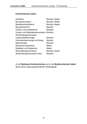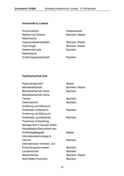 Drucksache 18/3888 Schleswig-Holsteinischer Landtag - 18. Wahlperiode Universität zu Lübeck Humanmedizin Staatsexamen Medical Life Science Bachelor, Master Medizinische Ingenieurwissenschaften Bachelor, Master Psychologie Bachelor, Master Medieninformatik Bachelor Medizinische Ernährungswissenschaft Bachelor Fachhochschule Kiel Agrarmanagement Master Betriebswirtschaft Bachelor, Master Betriebswirtschaft online Bachelor Betriebswirtschaft online Teilzeit Bachelor Elektrotechnik Bachelor Erziehung und Bildung im Kindesalter Aufbauform Bachelor Erziehung und Bildung im Kindesalter, grundständig Bachelor Forschung, Entwicklung, Management in Sozialer Arbeit, Rehabilitation/Gesundheit oder Kindheitspädagogik Master Informationstechnologie & Internet Bachelor Internationales Vertriebs- und Einkaufsingenieurwesen Bachelor Landwirtschaft Bachelor Maschinenbau Bachelor, Master Multi Media Production Bachelor 16
