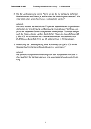 Drucksache 18/3482 Schleswig-Holsteinischer Landtag - 18. Wahlperiode 2. Hat die Landesregierung bereits Pläne, wie sie die zur Verfügung stehenden Mittel einsetzen wird? Wenn ja, wofür sollen die Mittel eingesetzt werden? Wie viele Mittel sollen an die Kommunen weitergeleitet werden? Antwort: Das Land erstattet als überörtlicher Träger der Jugendhilfe den Jugendämtern die Kosten der Unterbringung und Betreuung minderjähriger Flüchtlinge. Auf- grund der steigenden Zahlen unbegleiteter minderjähriger Flüchtlinge steigen auch die Kosten, die das Land an die örtlichen Träger der Jugendhilfe gemäß § 89d SGB VIII zu erstatten hat. Diese Kosten werden voraussichtlich von 25,5 Millionen Euro (Soll 2015) auf 65 Millionen Euro in 2016 ansteigen. 3. Beabsichtigt die Landesregierung, eine Aufnahmequote (§ 42c SGB VIII im Gesetzentwurf) mit anderen Bundesländern zu vereinbaren? Antwort: Die gesetzlich vorgesehene Verteilung nach dem Königsteiner Schlüssel si- chert aus Sicht der Landesregierung eine angemessene bundesweite Vertei- lung. 2