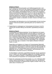 SCHLESWIG-HOLSTEINISCHER LANDTAG Drucksache 18/248 18. Wahlperiode 2012-10-30 Kleine Anfrage Sven Krumbeck (PIRATEN) und Antwort der Landesregierung – Ministerium für Justiz, Kultur und Europa Computerspiele als Kulturgut Seit 2008 hat der Bundesverband der Entwickler von Computerspielen (Game) einen Sitz im Deutschen Kulturrat. Computerspiele gelten seit 2008 als Kulturgut. Vorbemerkung der Landesregierung: Mit der Aufnahme des Spieleentwickler-Bundesverbands G.A.M.E. im Jahre 2008 in die Sektion Film und audiovisuelle Medien des Deutschen Kulturrates sind Compu- terspiele als Gegenstand der Kulturpolitik anerkannt worden. Auch der vom Bundes- tag, der Bundesregierung und der Computerspielebranche ausgelobte Deutsche Computerspielepreis trägt dazu bei, Computerspiele als Kulturgut anzuerkennen. 1. Wie beurteilt die Landesregierung den Status von Computerspielen als Kultur- gut? Antwort zu Frage 1: Als Produkte der Kulturwirtschaft haben Computerspiele einen anderen Cha- rakter als klassische Kulturgüter. Wie keine andere Sparte stehen sie in einem Spannungsfeld von Kunst, Ökonomie und Gesellschaft. Und wie kaum eine andere Sparte sind sie von diesem Doppelcharakter geprägt, Kultur- und Wirt- schaftsgut gleichermaßen zu sein. 2. Was tut die Landesregierung, um diesem Status in den Bereichen Kultur und Bildung gerecht zu werden?