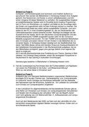Antwort zu Frage 4: Computer- und Konsolenspiele sind technisch und inhaltlich äußerst an- spruchsvoll. Hier werden die Bibliotheken in Schleswig-Holstein ihrer Aufgabe gerecht, ihre Nutzerinnen und Nutzer zu einem selbstbewussten und kriti- schen Umgang mit dieser Medienart zu verhelfen. Ein ausgewähltes Angebot an empfehlenswerten Spielen wird im Einzelfall durch kreative Programmar- beit (in Form von Workshops u.ä.) ergänzt und bildet so die Grundlage dafür, die Kinder und Jugendlichen aktiv mit dem Kulturgut vertraut zu machen. Die Büchereizentrale bietet seit vielen Jahren ausgewählte Computer- und Lern- spiele für den PC in ihren Empfehlungslisten an, die von Rezensenten der Lektoratskooperation positiv bewertet wurden. Wichtige Grundlagen bei der Auswahl sind die Spiele, die für den Deutschen Computerspielpreis und den Kindersoftwarepreis TOMMI ausgewählt wurden oder mit der Comenius- Medaille ausgezeichnet wurden. Für den TOMMI sind bundesweit Bibliotheken aktiv im Einsatz und testen intensiv mit den Kindern in der Bibliothek die no- minierten Spiele. In Schleswig-Holstein beteiligt sich die Stadtbibliothek Kiel daran. Seit Mitte dieses Jahres wird darüber hinaus ein Austauschbestand mit den beliebtesten Konsolenspielen in der Büchereizentrale aufgebaut, der es den Bibliotheken ermöglicht, gegen eine geringe Gebühr ihren eigenen Be- stand zu ergänzen. 2013 wird die Büchereizentrale eine Fortbildung zum Thema „Gaming in Bibli- otheken“ mit Christoph Deeg anbieten, einem der wichtigsten Fürsprecher in Deutschland für das Gaming in kulturellen Einrichtungen. Gamelounges bestehen in Bibliotheken in Schleswig-Holstein nicht. 5. Hat die Landesregierung Kenntnisse über die Funktionalitäten und Applikatio- nen sowie ihre Potentiale für die Kultur- und Wissensvermittlung? Wenn ja, wie sehen diese im Einzelnen aus? Antwort zu Frage 5: Anlässlich des vom Netzwerk Medienkompetenz organisierten Medienkompe- tenztages 2012 wurden Themen wie: „Gamedesigning“ und „Computerspiele im Unterricht“ durch Vorträge und Workshops behandelt. Auf der Webseite des Netzwerkes wird die Broschüre „Spielbar.de - Ein Leitfaden für Lehrkräfte“ (zum Einsatz von Computerspielen) angeboten. In den Lehrplänen für allgemeinbildende und berufsbildende Schulen gibt es eine Reihe von Hinweisen zum Einsatz von computergestützten Simulationen und Spielen (bei Drucklegung der Lehrpläne 1997 war der Begriff „Game“ noch nicht geläufig) wie z.B. Mathematik Sek. 2: „Softwareeinsatz und compu- tergestützte Simulationen“. Auch auf dem Medienportal des IQSH, auf dem sich die Lehrkräfte mit urhe- berrechtlich einwandfreien digitalen Medien versorgen können, finden sich un- terrichtsrelevante Spiele.