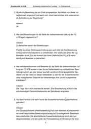 Drucksache 18/4538 Schleswig-Holsteinischer Landtag - 18. Wahlperiode 2. Wurde die Bewerbung der am Ende ausgewählten Kandidatin von dieser un- aufgefordert eingereicht und wenn nein, durch wen erfolgte eine entsprechen- de Aufforderung zur Bewerbung? Antwort: Ja. 3. Wie viele Bewerbungen für die Stelle der stellvertretenden Leitung der PD AFB lagen insgesamt vor? Antwort: Zu betrachten waren drei Bewerbungen. Parallel zu dieser Stellenausschreibung war auch über die Nachbesetzung eines anderen Dienstpostens zu entscheiden. Hier setzte sich einer der o.g. Bewerber durch. Für die Auswahl der freien Stelle bei der PD AFB waren damit zwei Bewerber zu betrachten. 4. Wie viele Bewerberinnen und Bewerber für die Stelle der stellvertretenden Lei- tung der PD AFB wurden in den für die Stellenbesetzung maßgeblichen Beur- teilungen gleich gut oder besser beurteilt, als die am Ende ausgewählte Kan- didatin und wie viele von diesen bekleideten zu dem für die Auswahlentschei- dung maßgeblichen Zeitpunkt ein höherwertiges Amt, als die ausgewählte Kandidatin? Antwort: Die Frage kann nicht beantwortet werden. Eine Beantwortung würde in die schutzwürdigen Persönlichkeitsrechte der Betroffenen eingreifen. 5. Von wem konkret und wann wurde die Auswahlentscheidung abschließend getroffen? Antwort: Das Landespolizeiamt (Personalabteilung) hat nach üblichem Auswahlverfah- ren einen begründeten Besetzungsvorschlag auf Grundlage einer Bestenaus- lese unterbreitet. Die abschließende Auswahlentscheidung durch den Lan- despolizeidirektor und den Leiter der Polizeiabteilung im Ministerium für Inne- 2