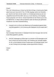 Drucksache 19/1058 Schleswig-Holsteinischer Landtag - 19. Wahlperiode Antwort: Wie in der Vorbemerkung zur Antwort auf die Kleine Anfrage „Umsetzung des Digital- pakts Schule durch das Land“(LT-Drs. 19/1056) dargelegt, stehen die Verhandlun- gen zwischen dem Bund und den Ländern zur Verwaltungsvereinbarung über den „DigitalPakt Schule 2019 bis 2023“ zwar kurz vor dem Abschluss, eine endgültige Fassung liegt aber noch nicht vor. Danach beschränkt sich die Förderung auf inves- tive Maßnahmen. Zu diesen zählt grundsätzlich weder die Wartung der geförderten Investitionen noch deren Ersatzbeschaffung. 3. Inwieweit ist die vom Bund unter Mitwirkung der Bundesländer geplante Natio- nale Bildungsplattform in die Umsetzung des Digitalpakts Schule eingebunden? Antwort: Nach derzeitigem Stand werden im Digitalpakt Schule keine Aussagen über eine Na- tionale Bildungsplattform getroffen. 4. Sind der Landesregierung Äußerungen von Vertretern der Bundesregierung be- kannt, wonach sich der Bund künftig in der Fortbildung der Lehrkräfte engagie- ren will, und wie bewertet sie deren Auswirkungen auf Schleswig-Holstein, auch vor dem Hintergrund der derzeitigen verfassungsrechtlichen Situation? Antwort: Nein. 2
