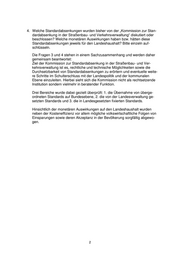 4. Welche Standardabsenkungen wurden bisher von der „Kommission zur Stan- dardabsenkung in der Straßenbau- und Verkehrsverwaltung“ diskutiert oder beschlossen? Welche monetären Auswirkungen haben bzw. hätten diese Standardabsenkungen jeweils für den Landeshaushalt? Bitte einzeln auf- schlüsseln. Die Fragen 3 und 4 stehen in einem Sachzusammenhang und werden daher gemeinsam beantwortet: Ziel der Kommission zur Standardabsenkung in der Straßenbau- und Ver- kehrsverwaltung ist es, rechtliche und technische Möglichkeiten sowie die Durchsetzbarkeit von Standardabsenkungen zu erörtern und eventuelle weite- re Schritte im Schulterschluss mit der Landespolitik und der kommunalen Ebene einzuleiten. Hierbei sieht sich die Kommission nicht als rechtsetzende Institution sondern vielmehr in beratender Funktion. Drei Bereiche wurde dabei gezielt überprüft: 1. die Übernahme von überge- ordneten Standards auf Bundesebene, 2. die von der Landesverwaltung ge- setzten Standards und 3. die in Landesgesetzten fixierten Standards. Hinsichtlich der monetären Auswirkungen auf den Landeshaushalt wurden neben der Kosteneffizienz vor allem mögliche volkswirtschaftliche Folgen von Einsparungen sowie deren Akzeptanz in der Bevölkerung sorgfältig abgewo- gen. 2