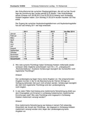 Drucksache 18/2050 Schleswig-Holsteinischer Landtag - 18. Wahlperiode den Ankunftsmonat der syrischen Staatsangehörigen, die sich auf der Grund- lage der Anordnung des Landes gemäß § 23 Absatz 1 des Aufenthaltsge- setzes (Erlasse vom 28.08.2013 und 25.02.2014) bislang nach Schleswig- Holstein begeben haben. Zum Stichtag 31.05.2014 wurden insoweit 129 Visa erteilt. Der Zugang der syrischen Asylerstantragstellerinnen und Asylerstantragsteller hat sich seit Anfang 2011 wie folgt entwickelt: 2011 2012 2013 bis Mai 2014 Januar 8 18 33 83 Februar 12 19 38 71 März 12 16 21 99 April 9 14 10 80 Mai 10 30 41 109 Juni 6 14 47 Juli 6 22 68 August 8 49 55 September 17 25 96 Oktober 5 52 126 November 16 41 59 Dezember 10 32 64 Gesamtzahl 119 332 658 442 2. Wie viele syrische Flüchtlinge haben Schleswig-Holstein mittlerweile wieder verlassen (bitte möglichst aufschlüsseln nach Art, z. B. „untergetaucht“, „Rücküberstellung“). Existieren Schätzungen bezüglich der Dunkelziffer nicht registrierter Flüchtlinge? Antwort: Der Landesregierung liegen hierzu keine Angaben vor. Die entsprechenden Angaben konnten in der für die Beantwortung der Kleinen Anfrage zur Verfügung stehenden Zeit auch nicht erhoben werden. Schätzungen bezüglich der Zahl nicht registrierter Flüchtlinge sind der Landesregierung nicht möglich. 3. In wie vielen Fällen fand bislang eine medizinische Notverbringung direkt aus dem Krisengebiet und Anrainern in schleswig-holsteinischen medizinischen Einrichtungen statt? Wie viele Flüchtlinge sind insgesamt in Schleswig- Holstein medizinisch versorgt worden? Antwort: Eine medizinische Notverbringung war bislang in keinem Fall notwendig. Hinsichtlich der Anzahl der Flüchtlinge, die insgesamt in Schleswig-Holstein medizinisch versorgt worden sind, liegen der Landesregierung keine Angaben vor.