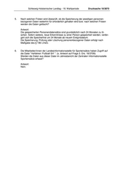 Schleswig-Holsteinischer Landtag - 18. Wahlperiode Drucksache 18/3870 5. Nach welchen Fristen wird überprüft, ob die Speicherung der jeweiligen personen- bezogenen Daten weiterhin für erforderlich gehalten wird bzw. nach welchen Fristen werden die Daten gelöscht? Antwort: Die gespeicherten Personendatensätze sind grundsätzlich nach 24 Monaten zu lö- schen. Sofern weitere, neue Erkenntnisse zu einer Person gespeichert werden, verlän- gert sich die Speicherfrist um 24 Monate ab neuem Ereignisdatum. Die Speicherung, Prüfung oder Löschung personenbezogener Daten erfolgt nach Maßgabe des § 196 LVwG. 6. Die Mitarbeiter/innen der Landesinformationsstelle für Sporteinsätze haben Zugriff auf die Datei ”Verfahren ’Fußball SH’ ”. (s. Antwort auf Frage 5. Drs. 18/3709): Werden die Daten aus dieser Datei im Jahresbericht der Zentralen Informationsstelle Sporteinsätze erfasst? Antwort: Nein.