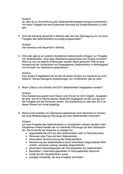 Antwort: Ja, dies ist zur Durchführung der Seitenstreifenfreigabe zwingend erforderlich. Vor einer Freigabe hat eine lückenlose Kontrolle auf Hindernisfreiheit zu erfol- gen. 3. Sind die Kameras dauerhaft in Betrieb oder wird die Übertragung nur vor einer Freigabe des Seitenstreifens kurzzeitig eingeschaltet? Antwort: Die Kameras sind dauerhaft in Betrieb. 4. Gibt oder gab es an anderen Autobahnen elektronische Anlagen zur Freigabe von Seitenstreifen, ohne dass Überwachungskameras zum Einsatz kommen? Wenn ja, wo und welche Erfahrungen wurden damit gemacht? Gibt es eine Auswertung der Unfallzahlen auf freigegebenen Seitenstreifen in Abhängigkeit vom Einsatz von Überwachungskameras? Antwort: Eine andere Freigabetechnik als die mit einem Einsatz von Kameras ist nicht bekannt. Hierauf bezogene Auswertungen von Unfallzahlen gibt es nicht. 5. Wann (Datum und Uhrzeit) sind 2013 Seitenstreifen freigegeben worden? Antwort: Eine Auswertung gezielt nach Datum und Uhrzeit ist nicht möglich. Ausgewer- tet wird, wie oft im Monat welcher Abschnitt freigegeben wurde und wie sich die Freigabe auf die Ferienzeit verteilt. Die Auswertung für das Jahr 2013 ist dieser Antwort am Ende beigefügt. 6. Warum sind anstelle von Überwachungskameras nicht Sensoren im Einsatz, die ohne Bildübertragung Fahrzeuge auf dem Seitenstreifen erkennen? Antwort: Um eine Freigabe des Seitenstreifens zu ermöglichen müssen deutlich mehr Situationen erfasst werden als nur stehende Fahrzeuge auf dem Seitenstrei- fen. Die Kontrolle hat lückenlos zu erfolgen für: liegenbleibende KFZ auf dem Seitenstreifen oder in Pannenbuchten Personen oder Tiere auf dem Seitenstreifen erkennbare Verschmutzung des Seitenstreifens Blockierung des Seitenstreifens durch erkennbare Gegenstände (Reif- enteile, verlorene Ladung, sonstige Gegenstände) erkennbare Beschädigungen der Schutzplanken am Seitenstreifen Baustellen / Unterhaltungsarbeiten im freizugebenden Abschnitt Unfall auf der Hauptfahrbahn sowie sonstige Umstände, die eine Freigabe verhindern.