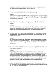 Eine andere Sensorik, die diese Anforderungen an eine Anlage zur temporä- ren Seitenstreifenfreigabe abdeckt, ist nicht bekannt. 7. Wer ist verantwortliche Stelle für die Videoüberwachung? Antwort: Verantwortliche Stelle für den Betrieb der Kameraanlage ist der Landesbetrieb Straßenbau und Verkehr Schleswig-Holstein (LBV-SH) (vgl. § 2 (2) und § 3 (7) Bundesdatenschutzgesetz). 8. Gibt es Pläne für weitere Überwachungskameras an Straßen in Schleswig- Holstein? Antwort: Pläne für die Installation weiterer Kameras für Beobachtungs- oder Kontroll- zwecke zur Verbesserung der Verkehrssicherheit an Straßen in Schleswig- Holstein im Zuständigkeitsbereich des LBV-SH bestehen derzeit nicht. 9. Wie hoch waren die Anschaffungs-, Installations- und Inbetriebnahmekosten für die gesamte Videoüberwachungsanlage samt dafür notwendiger neu er- richteter Infrastruktur? Antwort: Die Kosten zur Einrichtung der temporären Seitenstreifenfreigabe auf der A7 beliefen sich auf insgesamt 9.272.078,38 €. Die genannten Kosten enthalten auch die finanziellen Aufwendungen für die erforderlichen straßenbaulichen Maßnahmen. 10. Wie hoch sind die tatsächlichen oder zu erwartenden jährlichen Betriebs- und Instandshaltungskosten? Antwort: Die jährlichen Wartungskosten gemäß Wartungsvertrag belaufen sich auf 64.000,- €. Reparaturkosten die nicht durch diesen Vertrag abgedeckt sind kommen hinzu. Die zusätzlich anfallenden jährlichen Stromkosten können nicht gesondert für die Seitenstreifenfreigabe angegeben werden, da über ei- nen Strombereitstellungspunkt verschiedene Anlagen, auch solche die mit der Seitenstreifenfreigabe nichts zu tun haben, versorgt werden. Der Verbrauch wird jedoch nur über einen gemeinsamen Stromzähler abgerechnet. 11. Gab es oder gibt es Überlegungen oder technische Vorrichtungen für einen Zu- oder Abgriff auf/von die Bilder dieser Überwachungskameras durch Dritte wie z.B. durch die Polizeibehörden?
