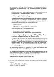 Zur Beantwortung der Frage ist hier nachstehend ein Auszug aus der Dienst- anweisung für das Bedienpersonal in der Betriebsdienstzentrale (BZ) wieder- gegeben: „Arbeitsanweisung zur Bedienung der temporären Seitenstreifenmitbenut- zung auf der A7 in Schleswig Holstein. Version 2.1 24.03.2003 3.3 Meldewege bei Verkehrsstörungen Soweit beobachtet, sind bei Verkehrsstörungen, die zu einem Schaltungs- abbruch führen, die zuständigen Dienststellen über die beobachteten Ver- kehrsstörungen zwecks weiterer Veranlassung zu informieren. Dies ist insbesondere die Information der Autobahnpolizei bei: - Unfällen jeder Art - Ungesicherten Pannen-Kfz auf dem Seitenstreifen Sowie Information der Autobahnmeisterei bei: - Verschmutzung des Seitenstreifens - Gegenständen auf dem Seitenstreifen / der Hauptfahrbahn Bei schwerwiegenden Ereignissen ist gemäß Anlage 2.2 zur Dienst- anweisung für die Beschäftigten der BZ zu verfahren. Auf Wunsch der Polizei kann die Videotechnik zur Informationsgewinnung (Feststellung der Lage der Unfallstelle, Art und Anzahl betroffener Kfz, blockierter Fahrstreifen, ggf. brennende Kfz etc.) genutzt werden. Analog kann auch seitens der Autobahnmeisterei der Einsatz der Videotechnik angefragt werden, um z.B. bei Gegenständen auf der Fahrbahn zusätzli- che Information gewinnen.“ Die Landespolizei hat keinen Zu- oder Abgriff auf Bilder dieser Anlagen. Dem- entsprechend gibt es auch keine Überlegungen dazu. Zur Beobachtung der aktuellen Verkehrslage werden die Kamerabilder auf der Seite www.strassen-sh.de in das Internet eingestellt. Sollte sich jedoch ein Un- fall ereignen, wird die Übertragung/Verbindung sofort beendet. Eine Speicherung der Daten erfolgt zu keiner Zeit. 12. Wie hoch ist die Auflösung der einzelnen Kameras und wie hoch die Bildrate? Antwort: Auflösung: 752 x 582 im PAL B Modus Bildrate: 12 Bilder pro Sekunde