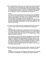 13. Kann ausgeschlossen werden, dass eine Identifizierung einzelner Fahrzeuge - sei es mittels Kennzeichenauslesung oder aufgrund besonderer Merkmale einzelner Fahrzeuge - über die Bilder dieser Überwachungskameras möglich ist und falls das nicht der Fall ist: In welcher Art und Weise werden die Nutzer der videoüberwachten Strecken vorher auf den Umstand der Videoüberwa- chung hingewiesen und gibt es die Möglichkeit des Ausweichens? Antwort: Ein Hinweis an die Verkehrsteilnehmer auf die Kameras wird nicht gegeben, da es sich beim Einsatz der Kameras um die Kontrolle des Seitenstreifenzu- stands vor der Freigabe für den Verkehr und zur Verkehrsbeobachtung wäh- rend der Freigabe handelt und nicht um eine Überwachung. Die Identifizierung eigenständiger und/oder individueller Fahrzeugmerkmale kann nicht völlig ausgeschlossen werden. Ausgeschlossen werden kann aber die Erkennung einzelner Fahrzeugführerinnen und Fahrzeugführer bzw. ein- zelner KFZ-Kennzeichen. 14. In welcher Art und Weise wurde die Landesdatenschutzbehörde bei Erarbei- tung und Umsetzung dieser Überwachungsmaßnahmen eingebunden? Antwort: Das Unabhängige Landeszentrum für Datenschutz (ULD) hat sich bereits im Juni 2004 im Rahmen eines Schriftwechsels zwischen ULD und dem Ministe- rium mit der Thematik befasst. Die ULD vertritt dazu in seinem 27. Tätigkeits- bericht (2005) Kapitel 4.5 Verkehr, Punkt 4.5.2 „A7 Richtung Norden – video- überwacht“ folgende Auffassung: „Die Videokameras dienen der Kontrolle des Standstreifens. Dieser wird bei starkem Fahrzeugverkehr als dritte Fahrspur freigegeben und muss vor der Freigabe auf Hindernisfreiheit überprüft werden. Für andere Zwecke, insbe- sondere zur Verfolgung von Verkehrsordnungswidrigkeiten oder gar Strafta- ten, dürfen die Videobilder nicht verwendet werden. Wir haben uns vergewis- sert, dass die Auflösung der Kameras so gering ist, dass einzelne Kfz- Kennzeichen oder Fahrzeugführer während der Vorbeifahrt an den Kameras nicht erkannt werden können.“ 15. Wie viel Personal ist für den Einsatz dieser Anlagen notwendig und in welcher Form werden die Bilder der Standstreifenkameras von diesen überwacht? Antwort: Unmittelbar vor und während der Freigabe des Seitenstreifens als zusätzlicher Fahrstreifen ist ein Mitarbeiter für den Betrieb dieser Anlage erforderlich.