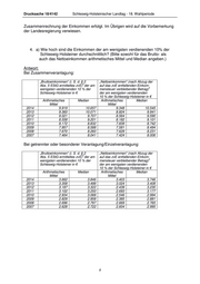 Drucksache 18/4142 Schleswig-Holsteinischer Landtag - 18. Wahlperiode angeben.) Antwort: Angaben zur Höhe des Vermögens liegen seit Abschaffung der Vermögensteuer ab dem 01. Januar 1997 nicht mehr vor. Im Übrigen wird auf die Vorbemerkung der Landesregierung verwiesen. b) Welchen Anteil am Gesamtvermögen haben die vermögendsten 10% der Schleswig-Holsteiner? Wie hat sich dieser Anteil in den letzten 10 Jahren entwickelt? Antwort: Auf die Antwort zu Frage 1 a) wird verwiesen. 2. a) Wie groß sind die Vermögen der am wenigsten vermögenden 10% der Schleswig-Holsteiner durchschnittlich? (Bitte arithmetisches Mittel und Median angeben.) Antwort: Auf die Antwort zu Frage 1 a) wird verwiesen. b) Welchen Anteil am Gesamtvermögen haben die am wenigsten vermögen- den 10% der Schleswig-Holsteiner? Wie hat sich dieser Anteil in den letzten 10 Jahren entwickelt? Antwort: Auf die Antwort zu Frage 1 a) wird verwiesen. Vorbemerkung der Landesregierung zu den Fragen 3 und 4: Bei der Beantwortung der Fragen 3 und 4 wurde als „Bruttoeinkommen“ das nach § 2 Abs. 5 des Einkommensteuergesetzes (EStG) zu ermittelnde zu versteuernde Ein- kommen (zvE) und als „Nettoeinkommen“ der nach Abzug der auf das zvE entfallen- 3 den Einkommensteuer verbleibende Betrag zugrunde gelegt . Berücksichtigt wurden nur die Personen, für die im Abfragezeitraum eine Einkommensteuerveranlagung durchgeführt wurde und deren zvE im jeweiligen Veranlagungszeitraum positiv war. Bei den Berechnungen wurde für jede Veranlagungsart (Zusammenveranlagung bei Ehegatten oder Lebenspartnern bzw. getrennte oder besondere Veranlagung/Einzel- veranlagung) eine eigene Gruppe gebildet. Der Abfragezeitraum ist auf die Veranlagungszeiträume 2007 bis 2014 begrenzt worden. Für die Veranlagungszeiträume 2005 und 2006 sind wegen der Umstellung auf das Automationsverfahren EOSS in der Finanzverwaltung im Jahr 2008 nur für die Fälle Festsetzungsdaten vorhanden, die nach dem Umstellungszeitpunkt gerech- net wurden. Aus diesem Grund ist für die Veranlagungszeiträume 2005 und 2006 keine vollständige Datenerhebung möglich. Veranlagungszeitraumübergreifende Vergleiche konnten deshalb nur für acht Veranlagungszeiträume vorgenommen wer- 3 Zur Berechnung vgl. R 2 der Einkommensteuer-Richtlinien; durch Einführung der sog. Abgeltungsteuer ist die auf bestimmte Kapitalerträge entfallende Einkommensteuer durch den vorgenommenen Steuerabzug nach § 43 Abs. 5 EStG abgegolten. Ab dem Veranlagungszeitraum 2009 sind daher nicht mehr sämtliche Kapitalerträge im Rahmen der Einkommensteuererklärung anzugeben und insoweit auch nicht mehr ermittelbar. 2