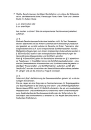 7. Welche Genehmigungen benötigen Berufsfischer, um entlang der Ostseeküs- te inkl. der Nebenarme Schlei, Flensburger Förde, Kieler Förde und Lübecker Bucht ihre Kutter / Boote a. an einem Anker oder b. an einer Bojen fest machen zu dürfen? Bitte die entsprechende Rechtsnorm(en) detailliert aufführen. Zu a. Konkrete Genehmigungserfordernisse bestehen nicht. Auf den Seewasser- straßen des Bundes ist das Ankern außerhalb der Fahrwasser grundsätzlich dort gestattet, wo es nicht verboten ist. Bereiche mit Anker- Festmache- oder Liegeverboten sind i.d.R. durch entsprechende Schifffahrtszeichen markiert. Maßgebliche Regelungen zum Ankern (insbesondere Ankerverbote) werden in § 32 SeeSchStrO sowie in den revierspezifischen Bekanntmachungen der Generaldirektion Wasserstraßen und Schifffahrt getroffen. Nach § 38 SeeschStrO gelten für Berufsfischer teilweise von § 32 abweichen- de Regelungen. In Einzelfällen können die Schifffahrtspolizeibehörden – dies sind die Generaldirektion Wasserstraßen und Schifffahrt sowie die jeweils zu- ständigen Wasserstraßen- und Schifffahrtsämter außerdem gemäß § 57 SeeSchStrO von den Vorschriften der Seeschifffahrtstraßenordnung befreien. Im Übrigen wird auf die Antwort zu Frage 6 verwiesen. Zu b. Sofern mit „Boje“ die Betonnung der Seewasserstraßen gemeint ist, so ist das Anlegen dort verboten. Für das Liegen an einer Boje oder an Festmachertonnen, für Bojenliegeplätze und Bojenliegefelder ist die Erteilung einer strom- und schifffahrtspolizeilichen Genehmigung (SSG) nach § 31 WaStrG erforderlich, die ggf. vom zuständigen Wasserstraßen- und Schifffahrtsamt nur erteilt wird, wenn keine Beeinträchti- gung des Zustandes der Bundeswasserstraße oder der Sicherheit und der Leichtigkeit des Schiffsverkehrs zu erwarten ist. Der Aspekt Berufsfischerei ist hierbei kein Prüfkriterium.