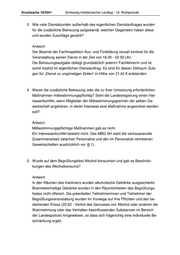 Drucksache 18/5341 Schleswig-Holsteinischer Landtag - 18. Wahlperiode 3. Wie viele Dienststunden außerhalb des eigentlichen Dienstauftrages wurden für die zusätzliche Betreuung aufgewandt, welchen Gegenwert haben diese und wurden Zuschläge gezahlt? Antwort: Der Beamte der Fachinspektion Aus- und Fortbildung versah konkret für die Veranstaltung seinen Dienst in der Zeit von 16.00 - 02.00 Uhr. Die Betreuungsaufgabe obliegt grundsätzlich jedem/r Fachlehrer/in und ist somit implizit im eigentlichen Dienstauftrag. Es sind für diesen Zeitraum Zula- gen für „Dienst zu ungünstigen Zeiten“ in Höhe von 21,42 € entstanden. 4. Waren die zusätzliche Betreuung oder die zu ihrer Umsetzung erforderlichen Maßnahmen mitbestimmungspflichtig? Sieht die Landesregierung einen Inte- ressenkonflikt, wenn Mitglieder der Mitbestimmungsgremien der selben Ge- werkschaft angehören, in deren Interesse eine Maßnahme angeordnet werden soll? Antwort: Mitbestimmungspflichtige Maßnahmen gab es nicht. Ein Interessenkonflikt besteht nicht. Das MBG SH sieht die vertrauensvolle Zusammenarbeit zwischen Personalrat und den im Personalrat vertretenen Gewerkschaften ausdrücklich vor (§ 1). 5. Wurde auf dem Begrüßungsfest Alkohol konsumiert und gab es Beschrän- kungen des Alkoholkonsums? Antwort: In den Räumen des Kantiniers wurden alkoholische Getränke ausgeschenkt. Branntweinhaltige Getränke wurden in den Räumlichkeiten des Begrüßungs- festes nicht offeriert. Die potentiellen Teilnehmerinnen und Teilnehmer der Begrüßungsveranstaltung wurden im Vorwege auf ihre Pflichten und den be- stehenden Erlass (20.62 - Verbot des Genusses von Alkohol oder anderen die Wahrnehmung oder das Verhalten beeinflussenden Substanzen im Bereich der Landespolizei) hingewiesen, so dass sich folgerichtig eine individuelle Be- schränkung ergibt.