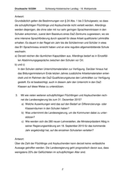 Drucksache 18/3394 Schleswig-Holsteinischer Landtag - 18. Wahlperiode Antwort: Grundsätzlich gelten die Bestimmungen von § 24 Abs. 1 bis 3 Schulgesetz; so dass die schulpflichtigen Flüchtlinge und Asylsuchende nicht verteilt werden. Allerdings werden diejenigen, die ohne oder mit nur sehr geringen Sprachkenntnissen in den Schulen ankommen, zuerst dem Basiskurs eines DaZ-Zentrums zugewiesen, wo sie eine intensive Sprachförderung durch speziell für diese Arbeit qualifizierte Lehrkräfte erhalten. Es dauert in der Regel ein Jahr bis die Schülerinnen und Schüler in etwa das B1-Sprachniveau erreicht haben und an eine reguläre allgemeinbildende Schule wechseln. a) Derzeit reichen die räumlichen Kapazitäten aus. Allerdings bedarf es in Einzelfäl- len Abstimmungsgespräche zwischen den Schulen vor Ort. b) und c) In den Schulen stehen Unterrichtsmaterialien zur Verfügung. Darüber hinaus hat das Bildungsministerium Ende letzten Jahres zusätzliche Arbeitsmaterialien entwi- ckelt und im Rahmen der DaZ-Qualifizierungskurse den Lehrkräften zur Verfügung gestellt. Es ist beabsichtigt, auch in diesem Jahr den Unterricht in den DaZ- Klassen auf diese Weise zu unterstützen. 3. Mit wie vielen weiteren schulpflichtigen Flüchtlingen und Asylsuchenden rech- net die Landesregierung bis zum 31. Dezember 2015? a) Welche Auswirkungen wird das auf den Bedarf an Differenzierungs- oder Klassenräumen in den Schulen haben? b) Was unternimmt die Landesregierung, um die Kommunen dabei zu unter- stützen? c) Wie werden sich die 280 neuen Lehrerstellen, die Ministerpräsident Albig in seiner Regierungserklärung am 18. September 2015 für das kommende Jahr angekündigt hat, auf die einzelnen Schularten verteilen? Antwort: Über die Zahl der Flüchtlinge und Asylsuchenden kann derzeit keine verlässliche Aussage getroffen werden. Die Landesregierung geht prognostisch davon aus, dass wenigstens 20% der Geflüchteten im schulpflichtigen Alter sind. 2