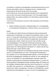 a) Ein Bedarf an zusätzlichen Raumkapazitäten ist dementsprechend derzeit nicht im Einzelnen abzuschätzen. Sollte es zu Engpässen kommen, unterstützt das Bil- dungsministerium die Schulen bei der Suche nach Lösungen. b) Auf Antrag können kommunale Infrastrukturmaßnahmen durch zinsgünstige Dar- lehen aus dem Kommunalen Investitionsfonds gem. § 22 Finanzausgleichsgesetz gefördert werden; dazu gehört grundsätzlich auch die Schaffung zusätzlich benötig- ter Klassenräume. c) Es ist noch nicht entschieden, wie die bis zu 280 Lehrerstellen auf die Schularten verteilt werden. 4. Werden Lehrkräfte und Erzieher in Schleswig-Holstein fort- und weitergebildet, um traumatisierte Flüchtlingskinder zu erkennen? Wenn ja, wie und durch wen? Antwort: Für Lehrkräfte, die im Bereich Deutsch als Zweitsprache tätig sind, bietet das Bil- dungsministerium Fortbildungen zum Umgang mit traumatisierten Kindern im Unter- richt an. In 15 regionalen Veranstaltungen in allen Kreisen und kreisfreien Städten des Landes können bzw. konnten Lehrkräfte Grundlagenwissen über psychische Traumatisierungen erhalten. Darüber hinaus können DaZ-Lehrkräfte (und ggf. Schulsozialpädagogen) in fünf regionalen Fortbildungsveranstaltungen vertiefte Kenntnisse im Umgang mit traumatisierten Kindern erwerben. Alle Fortbildungsan- gebote werden vom Fortbildungszentrum Wendepunkt e.V. realisiert, das über lang- jährige Erfahrungen in diesem Bereich verfügt. Für pädagogisches Fachpersonal von Kindertageseinrichtungen werden unterschied- liche Fort- und Weiterbildungen zum Thema „Traumatisierte Flüchtlingskinder in Kita“ angeboten und vom Land Schleswig-Holstein gefördert. Je nach konkretem Be- darf können die pädagogischen Fachkräfte sich zwischen ein- oder zweitägigen Se- minaren und modulhaften Fort- oder Weiterbildungen entscheiden. Neben dem Deutschen Kinderschutzbund Landesverband Schleswig-Holstein e.V. und dem Ver- band Evangelischer Kindertageseinrichtungen Schleswig-Holstein (VEK) bieten auch der Paritätische Schleswig-Holstein sowie das Institut für berufliche Aus- und Fortbil- dung (IBAF) oben genannte Fort- und Weiterbildungen an. Das pädagogische Fach- personal lernt in diesen Veranstaltungen, Traumata von Flüchtlingskindern und dem- entsprechenden Handlungsbedarf zu erkennen und durch traumapädagogisch an- 3