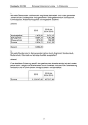 Drucksache 18/ 4196 Schleswig-Holsteinischer Landtag - 18. Wahlperiode 2. Wie viele Überstunden und finanziell vergütbare Mehrarbeit sind in den genannten Jahren bei der Landespolizei hinzugekommen? Bitte getrennt nach Schutzpolizei, Kriminalpolizei, Wasserschutzpolizei und insgesamt angeben. Antwort: 2016 (bis 2015 30.04.2016) Kriminalpolizei -1.439,00 5.474,12 Schutzpolizei 13.054,72 -1.263,88 Wasserschutz 1.219,00 -962,68 Summe 12.834,72 3.247,56 Gesamt 16.082,28 3. Wie viele Stunden sind in den genannten Jahren durch Krankheit, Sonderurlaub, Mutterschutz, Elternzeit und sonstige Ausfälle ausgefallen? Antwort: Eine detaillierte Erfassung gemäß den gewünschten Kriterien erfolgt bei der Landes- polizei nicht. Lediglich die Ausfallzeiten durch Krankheit sind durch die Zeiterfassung verlässlich und im Sinne dieser Anfrage ausweis- und darstellbar. 2016 (bis 2015 30.04.2016) Summe 1.229.147,40 457.017,98 2
