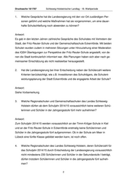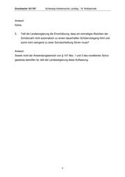 Drucksache 18/1787 Schleswig-Holsteinischer Landtag - 18. Wahlperiode Antwort: Keine. 5. Teilt die Landesregierung die Einschätzung, dass ein einmaliges Absinken der Schülerzahl nicht automatisch zu einem dauerhaften Schülerrückgang führt und somit nicht zwingend zu einer Schulschließung führen muss? Antwort: Soweit nicht der Anwendungsbereich von § 147 Abs. 1 und 3 des novellierten Schul- gesetzes betroffen ist, teilt die Landesregierung diese Auffassung. 3