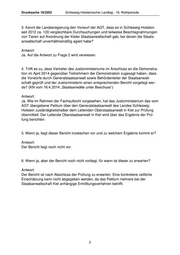 Drucksache 18/2202 Schleswig-Holsteinischer Landtag - 18. Wahlperiode 3. Kennt die Landesregierung den Vorwurf der AGT, dass es in Schleswig-Holstein seit 2012 ca. 120 vergleichbare Durchsuchungen und teilweise Beschlagnahmungen von Tieren auf Anordnung der Kieler Staatsanwaltschaft gab, bei denen die Staats- anwaltschaft unverhältnismäßig agiert habe? Antwort: Ja. Auf die Antwort zu Frage 2 wird verwiesen. 4. Trifft es zu, dass Vertreter des Justizministeriums im Anschluss an die Demonstra- tion im April 2014 gegenüber Teilnehmern der Demonstration zugesagt haben, dass die Vorwürfe durch Generalstaatsanwalt sowie Behördenleiter der Staatsanwalt- schaft geprüft und der Justizministerin einen entsprechenden Bericht vorgelegt wer- de? (KN vom 16.4.2014 „Staatsanwälte unter Beschuss“) Antwort: Ja. Wie im Rahmen der Fachaufsicht vorgesehen, hat das Justizministerium das vom AGT übergebene Petitum über den Generalstaatsanwalt des Landes Schleswig- Holstein zuständigkeitshalber dem Leitenden Oberstaatsanwalt in Kiel zur Prüfung übermittelt. Der Leitende Oberstaatsanwalt in Kiel wird über das Ergebnis der Prü- fung berichten. 5. Wenn ja, liegt dieser Bericht inzwischen vor und zu welchem Ergebnis kommt er? Antwort: Der Bericht liegt noch nicht vor. 6. Wenn ja, aber der Bericht noch nicht vorliegt, für wann ist dieser zu erwarten? Antwort: Der Bericht ist nach Abschluss der Prüfung zu erwarten. Eine konkretere zeitliche Einschätzung kann nicht abgegeben werden, da das Petitum mehrere bei der Staatsanwaltschaft Kiel anhängige Ermittlungsverfahren betrifft. 2