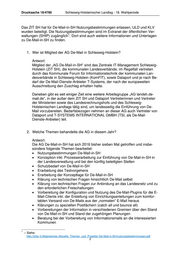 Drucksache 18/4780 Schleswig-Holsteinischer Landtag - 18. Wahlperiode Das ZIT SH hat für De-Mail-in-SH Nutzungsbestimmungen erlassen, ULD und KLV wurden beteiligt. Die Nutzungsbestimmungen sind im Extranet der öffentlichen Ver- 1 waltungen (SHIP) zugänglich . Dort sind auch weitere Informationen und Unterlagen zu De-Mail-in-SH zu finden. 1. Wer ist Mitglied der AG De-Mail in Schleswig-Holstein? Antwort: Mitglied der „AG De-Mail-in-SH“ sind das Zentrale IT-Management Schleswig- Holstein (ZIT SH), die kommunalen Landesverbände, im Regelfall vertreten durch das Kommunale Forum für Informationstechnik der kommunalen Lan- desverbände in Schleswig-Holstein (KomFIT), sowie Dataport und je nach Be- darf der De-Mail-Dienste-Anbieter T-Systems, der nach der europaweiten Ausschreibung den Zuschlag erhalten hatte. Daneben gibt es seit einiger Zeit eine weitere Arbeitsgruppe „AG landsh.de- mail.de“, in der außer dem ZIT SH und Dataport Vertreterinnen und Vertreter der Ministerien sowie des Landesrechnungshofs und des Schleswig- Holsteinischen Landtags tätig sind, um landesseitig die Einführung von De- Mail vorzubereiten. Bedarfsbezogen nehmen an dieser AG auch Vertreter von Dataport und T-SYSTEMS INTERNATIONAL GMBH (TSI, als De-Mail- Dienste-Anbieter) teil. 2. Welche Themen behandelte die AG in diesem Jahr? Antwort: Die AG De-Mail-in-SH hat sich 2016 bisher sieben Mal getroffen und insbe- sondere folgende Themen bearbeitet: Nutzungsbestimmungen De-Mail-in-SH Konzeption inkl. Prozesserarbeitung zur Einführung von De-Mail-in-SH in der Landesverwaltung und bei den künftig beteiligten Stellen Schutzbedarf von De-Mail-in-SH Erarbeitung des Testvorgehens Erarbeitung der Konzeptlage für De-Mail-in-SH Klärung von technischen Fragen hinsichtlich De-Mail selbst Klärung von technischen Fragen zur Anbindung an das Landesnetz und zu den erforderlichen Freischaltungen Vorbereitung der Konfiguration und Nutzung des De-Mail-Plugins für die E- Mail-Clients inkl. der Erstellung von Einrichtungsanleitungen zum komfor- tablen Versand von De-Mails aus der „normalen“ E-Mail heraus Klärungen zu speziellen Postfächern (catch all und bounce all) Vorbereitungen der Information in verschiedenen Gremien über den Stand von De-Mail-in-SH und Stand der zugehörigen Planungen Beratung bei der Vorbereitung von Informationsmails an die interessierten Kommunen 1 – Siehe: http://ship/-3.Allgemeines/-Aktuelle_Themen_und_Projekte/-De-Mail-in-SH/nutzungsbestimmungen.pdf 2