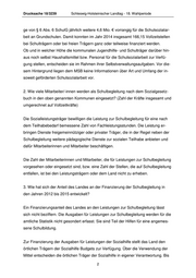 Drucksache 18/3239 Schleswig-Holsteinischer Landtag - 18. Wahlperiode ge von § 6 Abs. 6 SchulG jährlich weitere 4,6 Mio. € vorrangig für die Schulsozialar- beit an Grundschulen. Damit konnten im Jahr 2014 insgesamt 166,15 Vollzeitstellen bei Schulträgern oder bei freien Trägern ganz oder teilweise finanziert werden. Ob und in welcher Höhe die kommunalen Jugendhilfe- und Schulträger darüber hin- aus noch selbst Haushaltsmittel bzw. Personal für die Schulsozialarbeit zur Verfü- gung stellen, entscheiden sie im Rahmen ihrer Selbstverwaltungsaufgaben. Vor die- sem Hintergrund liegen dem MSB keine Informationen über Art und Umfang der in- soweit geförderten Schulsozialarbeit vor. 2. Wie viele Mitarbeiter/-innen werden als Schulbegleitung nach dem Sozialgesetz- buch in den oben genannten Kommunen eingesetzt? (Zahl der Kräfte insgesamt und umgerechnet auf Vollzeitkräfte) Die Sozialleistungsträger bewilligen die Leistung zur Schulbegleitung für eine nach dem Teilhabebedarf bemessene Zahl von Fachleistungsstunden. Die Leistung er- bringen Dienste freigemeinnütziger oder privater Träger, die in der Regel neben der Schulbegleitung weitere pädagogische Dienste zur sozialen Teilhabe anbieten und dafür Mitarbeiterinnen und Mitarbeiter beschäftigen. Die Zahl der Mitarbeiterinnen und Mitarbeiter, die für Leistungen zur Schulbegleitung vorgesehen oder eingesetzt sind, bzw. eine Zahl der Stellen, die auf Schulbegleitung entfallen, ist bei den Leistungsträgern oder dem Land nicht zu erheben. 3. Wie hat sich der Anteil des Landes an der Finanzierung der Schulbegleitung in den Jahren 2012 bis 2015 entwickelt? Ein Finanzierungsanteil des Landes an den Leistungen zur Schulbegleitung lässt sich nicht beziffern. Die Ausgaben für Leistungen zur Schulbegleitung werden für die amtliche Statistik nicht gesondert erfasst. Sie sind Teil der Hilfen für eine angemes- sene Schulbildung. Zur Finanzierung der Ausgaben für Leistungen der Sozialhilfe stellt das Land den örtlichen Trägern der Sozialhilfe Budgets zur Verfügung. Über die Verwendung der Mittel entscheiden die örtlichen Träger der Sozialhilfe in eigener Verantwortung. Bis 2