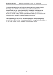 SCHLESWIG-HOLSTEINISCHER LANDTAG Drucksache 18/4737 18. Wahlperiode 20.10.2016 Kleine Anfrage des Abgeordneten Dr. Patrick Breyer (PIRATEN) und Antwort der Landesregierung - Ministerin für Justiz, Kultur und Europa Schwerpunktbereich in der Juristenausbildung 1. Haben sich Schwerpunktbereich und Schwerpunktprüfung aus Sicht der Landesregierung bewährt? 2. Wie steht die Landesregierung zu Vorschlägen, die Bedeutung des Schwerpunktbereichs und/oder der Schwerpunktprüfung im rechtswissenschaftlichen Studium zu verändern oder sie gar zu streichen (bitte begründen)? Antwort zu Frage 1 und 2 Die Fragen betreffen insbesondere bundesgesetzliche Rahmenregelungen zum Schwerpunktbereichsstudium und zur universitären Schwerpunktbereichsprüfung in §§ 5 ff. DRiG. Die Justizministerinnen und Justizminister der Länder erteilten dem für die Koordinierung der Juristenausbildung zuständigen Ausschuss (KOA) auf der Herbstkonferenz der Justizministerinnen und –minister 2014 (JuMiKo) den Auftrag, zur JuMiKo im November 2016 einen Bericht zu Harmonisierungsmöglichkeiten für die durch Ländergesetze ausgestalteten juristischen Prüfungen vorzulegen. Dieser Bericht soll sich u.a. mit den Vor- und Nachteilen und weiteren