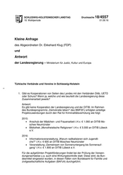 Drucksache 18/4557 Schleswig-Holsteinischer Landtag - 18. Wahlperiode Aus Sicht der Landesregierung ist es notwendig, zielgerichtete Strategien der Radikalisierungsprävention im Zusammenwirken mit der Zivilgesellschaft, zu der auch Moscheegemeinden und Religionsverbände gehören können, umzu- setzen. Daher ist die Förderung des Dialogs und möglicher Kooperationen, wie in diesen Fällen zwischen den Zuwendungsempfängern und den Akteuren des Landesprogramms gegen religiös motivierten Extremismus, eine Voraus- setzung für erfolgreiche Demokratiestärkung und Radikalisierungsprävention in dieser Zielgruppe. 2. Gibt es Kooperationen von Seiten des Landes mit den Verbänden oder Verei- nen, die der Hizmet-Bewegung nahestehen? Wenn ja, welche und wie beur- teilt die Landesregierung diese Zusammenarbeit jeweils? Antwort: Es gibt keine Kooperationen der Landesregierung und der Hizmet-Bewegung. 3. Gibt es Kooperationen von den 13 Schulen im Land, die Islamunterricht anbie- ten, mit den Verbänden Ditib oder Schura? Wenn ja, in welcher Weise? Antwort: Es gibt keine Kooperationen. 4. In welcher Form und in welcher Anzahl werden Schulbesuche durch die Ver- bände Ditib und Schura durchgeführt? Gibt es die Vermittlung von Moschee- besuchen und werden Fachtage zur islamischen Religion durch diese Ver- bände für Schulen unterstützt? Antwort: Es werden weder Schulbesuche durch die Verbände Ditib und Schura durch- geführt noch gibt es eine Vermittlung von Moscheebesuchen; darüber hinaus werden auch keine Fachtage dieser Verbände zur islamischen Religion unter- stützt. 5. Mit welchen muslimischen Verbänden führt die Landesregierung einen Dialog (vgl. Drs. 18/4004)? Wird ein Dialog mit den Verbänden Ditib oder Schura ge- führt? Wenn ja, wer von Seiten der Landesregierung führt diesen Dialog und welchen Inhalt haben die Gespräche? Antwort: Das MJKE hat mit der Schura, dem VIKZ und den Aleviten am 1.2.2016 und mit Ahmadiyya am 4.2.2016 Gespräche geführt. Ein weiteres Gespräch führte das MJKE mit der Schura, DITIB und dem VIKZ am 22. März 2016. Inhalt der Gespräche war die Prüfung gemeinsamer Vertragsverhandlungen. Ergebnis der Gespräche war, dass die zu behandelnden Themen für Vertragsverhand- lungen zu komplex sind, um in dieser Legislaturperiode zu einem Abschluss kommen zu können. Um gleichwohl im Dialog zu bleiben, werden seitens des MJKE mit DITIB und Schura separat Gespräche geführt werden. 2