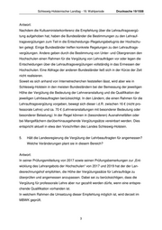 Schleswig-Holsteinischer Landtag - 19. Wahlperiode Drucksache 19/1508 Antwort: Nachdem die Kultusministerkonferenz die Empfehlung über die Lehrauftragsvergü- tung aufgehoben hat, haben die Bundesländer die Bestimmungen zu den Lehrauf- tragsvergütungen zum Teil in die Entscheidungs-/Regelungsbefugnis der Hochschu- len gelegt. Einige Bundesländer treffen konkrete Regelungen zu den Lehrauftrags- vergütungen. Andere geben durch die Bestimmung von Unter- und Obergrenzen den Hochschulen einen Rahmen für die Vergütung von Lehraufträgen vor oder legen die Entscheidungen über die Lehrauftragsvergütungen vollständig in das Ermessen der Hochschulen. Eine Abfrage der anderen Bundesländer ließ sich in der Kürze der Zeit nicht realisieren. Soweit es sich anhand von Internetrecherchen feststellen lässt, wird aber wie in Schleswig-Holstein in den meisten Bundesländern bei der Bemessung der jeweiligen Höhe der Vergütung die Bedeutung der Lehrveranstaltung und die Qualifikation der jeweiligen Lehrbeauftragten berücksichtigt. In den Ländern, die einen Rahmen für die Lehrauftragsvergütung vorgeben, bewegt sich dieser i.d.R. zwischen 16 € (nicht pro- fessorale Lehre) und ca. 70 € (Lehrveranstaltungen mit besonderer Bedeutung oder besonderer Belastung). In der Regel können in (besonderen) Ausnahmefällen oder bei Mangelfächern darüberhinausgehende Vergütungsätze vereinbart werden. Dies entspricht aktuell in etwa den Vorschriften des Landes Schleswig-Holstein. 5. Hält die Landesregierung die Vergütung der Lehrbeauftragten für angemessen? Welche Veränderungen plant sie in diesem Bereich? Antwort: In seiner Prüfungsmitteilung von 2017 sowie seinen Prüfungsbemerkungen zur „Ent- wicklung des Lehrangebots der Hochschulen“ von 2017 und 2019 hat der der Lan- desrechnungshof empfohlen, die Höhe der Vergütungssätze für Lehraufträge zu überprüfen und angemessen anzupassen. Dabei sei zu berücksichtigen, dass die Vergütung für professorale Lehre aber nur gezahlt werden dürfe, wenn eine entspre- chende Qualifikation vorhanden ist. In welchem Rahmen die Umsetzung dieser Empfehlung möglich ist, wird derzeit im MBWK geprüft. 3