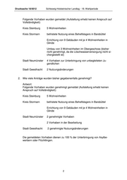 SCHLESWIG-HOLSTEINISCHER LANDTAG Drucksache 18/5012 18. Wahlperiode 2017-01-23 Kleine Anfrage des Abgeordneten Dr. Ekkehard Klug (FDP) und Antwort der Landesregierung - Minister für Inneres und Bundesangelegenheiten Sonderregelung für die Unterbringung von Flüchtlingen und Asylbegehrenden 1. Liegen der Landesregierung Erkenntnisse vor, wie viele Anträge im Sinne von § 85a LBO auf Errichtung von Wohngebäuden bis einschließlich Gebäude- klasse 4, die der Unterbringung von Flüchtlingen oder Asylbegehrenden in mindestens 20 % der Wohnungen des gesamten Gebäudes dienen, bisher gestellt wurden? Wenn ja, welche? Wenn nein, warum nicht? Antwort: Genaue Erkenntnisse liegen nicht vor, da im Ministerium für Inneres und Bun- desangelegenheiten keine Genehmigungsstatistiken aus den unteren Bauauf- sichtsbehörden vorliegen. Eine daher durchgeführte Umfrage bei den unteren Bauaufsichtsbehörde hat jedoch ergeben, dass nach in Kraft treten der Rege- lungen keine oder nur wenige Anträge im Sinne des § 85 a LBO gestellt wur- den. Das mag daher rühren, dass zu diesem Zeitpunkt der Zustrom von Asyl- bewerbern und Flüchtlingen schon stark nachgelassen hatte und noch genü- gend Wohnraum zur Verfügung stand bzw. steht. Vor in Kraft treten dieser Verfahrensbeschleunigungsregelung des § 85 a LBO haben die unteren Bau- aufsichtsbehörden Anträge (Neubau, Nutzungsänderungen oder Containeran- lagen) ohnehin zügig, zeitnah und bevorzugt bearbeitet.