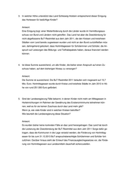 3. In welcher Höhe unterstützt das Land Schleswig-Holstein entsprechend dieser Einigung das Hortessen für bedürftige Kinder? Antwort: Eine Einigung bzgl. einer Weiterförderung durch die Länder wurde im Vermittlungsaus- schuss von Bund und Ländern nicht getroffen. Das Land hat aber die Zweckbindung für nicht abgeflossene BuT-Restmittel aus dem Jahr 2011, die den Kreisen und kreisfreien Städten vom Land bereits zugewiesen wurden und nicht an den Bund zurückfließen müs- sen, dahingehend gelockert, dass Hortmittagessen für Schülerinnen und Schüler, die An- spruch auf Leistungen des Bildungs- und Teilhabepakets haben, daraus finanziert werden können. 4. Ist diese Summe ausreichend, um alle Kinder, die bisher einen Anspruch auf einen Zu- schuss haben, auf dem bisherigen Niveau zu versorgen? Antwort: Die Summe ist ausreichend. Die BuT-Restmittel 2011 belaufen sich insgesamt auf 15,7 Mio. Euro. Hortmittagessen wurde durch Kreise und kreisfreie Städte im Jahr 2013 in Hö- he von rund 251.000 Euro gefördert. 5. Sind der Landesregierung Fälle bekannt, in denen Kinder nicht mehr am Mittagessen in Horteinrichtungen im Rahmen der Gewährung des Existenzminimums teilnehmen kön- nen, weil es für sie keinen Zuschuss durch das Land mehr gibt? Wenn ja, wie viele Kinder sind in welchen Kreisen betroffen? Wie beurteilt die Landesregierung diese Situation? Antwort: Es wurden bisher keine konkreten Fälle an das Land herangetragen. Das Land hat durch die Lockerung der Zweckbindung der BuT-Restmittel aus dem Jahr 2011 Sorge dafür ge- tragen, dass die Kommunen in die Lage versetzt werden, die Förderung von Hortmittag- essen für bis zum 31.12.2013 BuT-anspruchsberechtigte Schülerinnen und Schüler fort- zuführen. Darüber hinaus sieht der Entwurf des Finanzausgleichsgesetzes vor, die Förde- rung von Hortmittagessen aus Landesmitteln dauerhaft sicherzustellen.